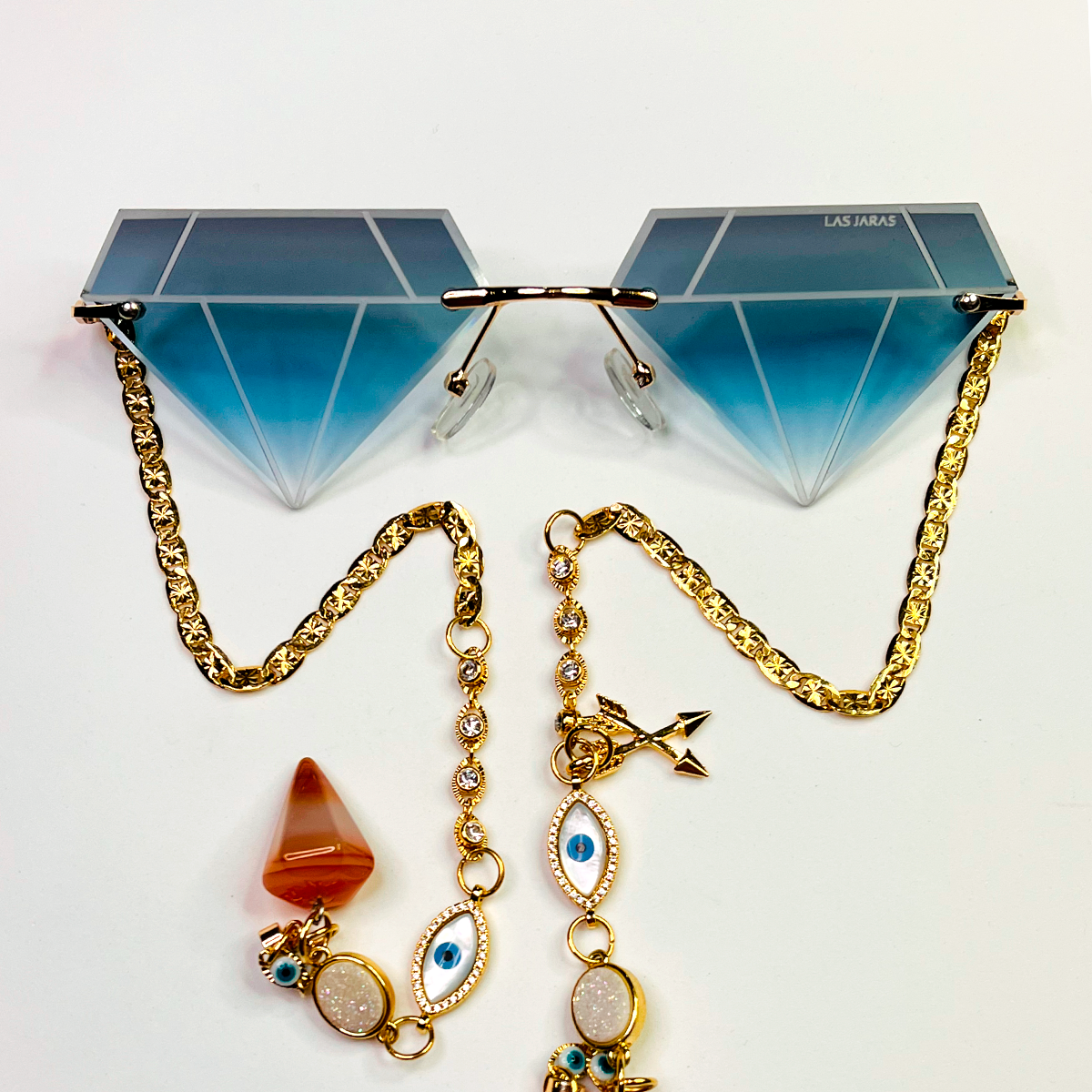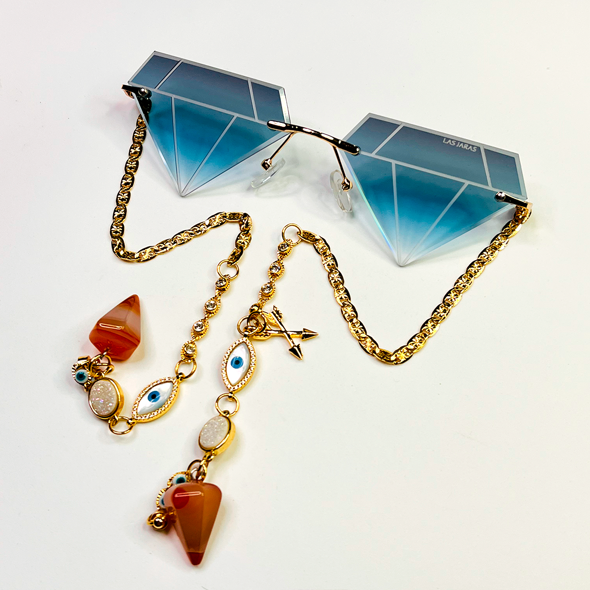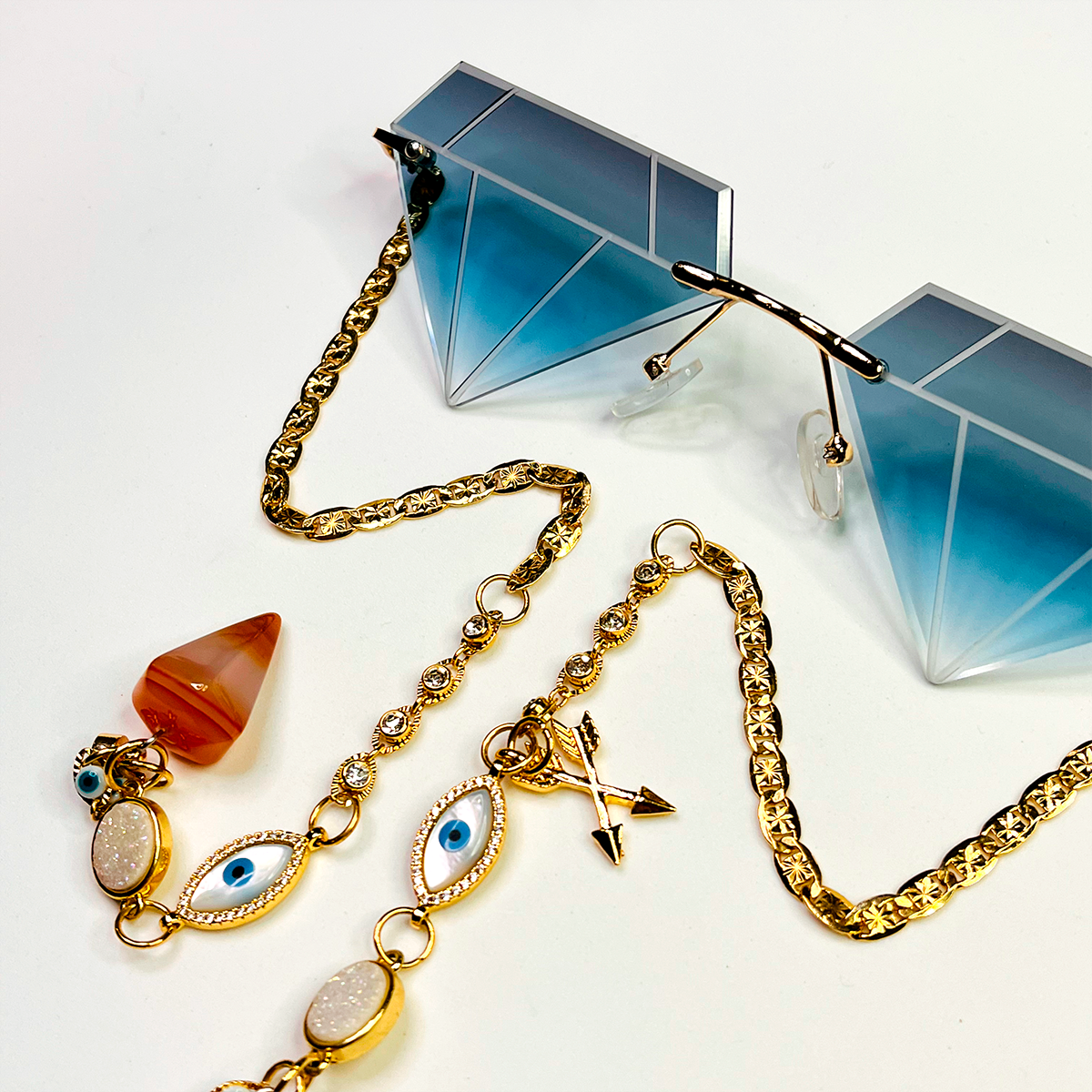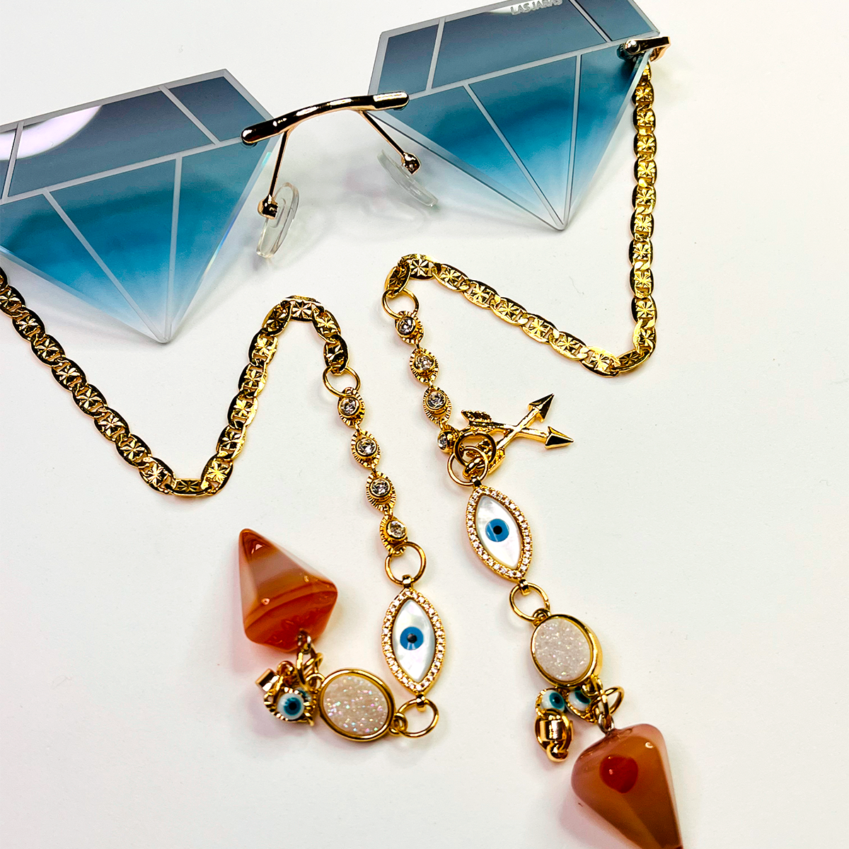 Blue diamond-shaped glasses, zirconia Turkish eye and red carnelian.