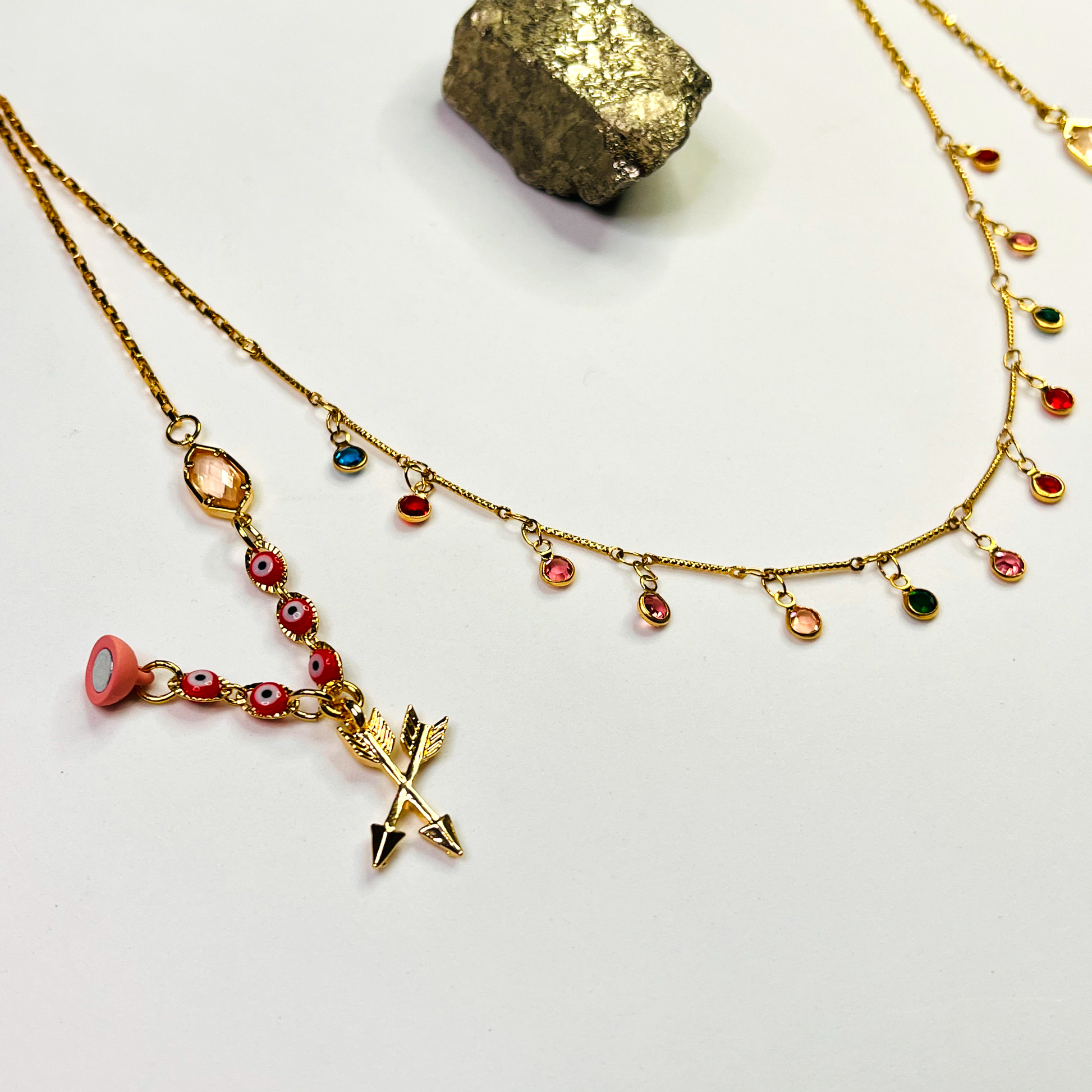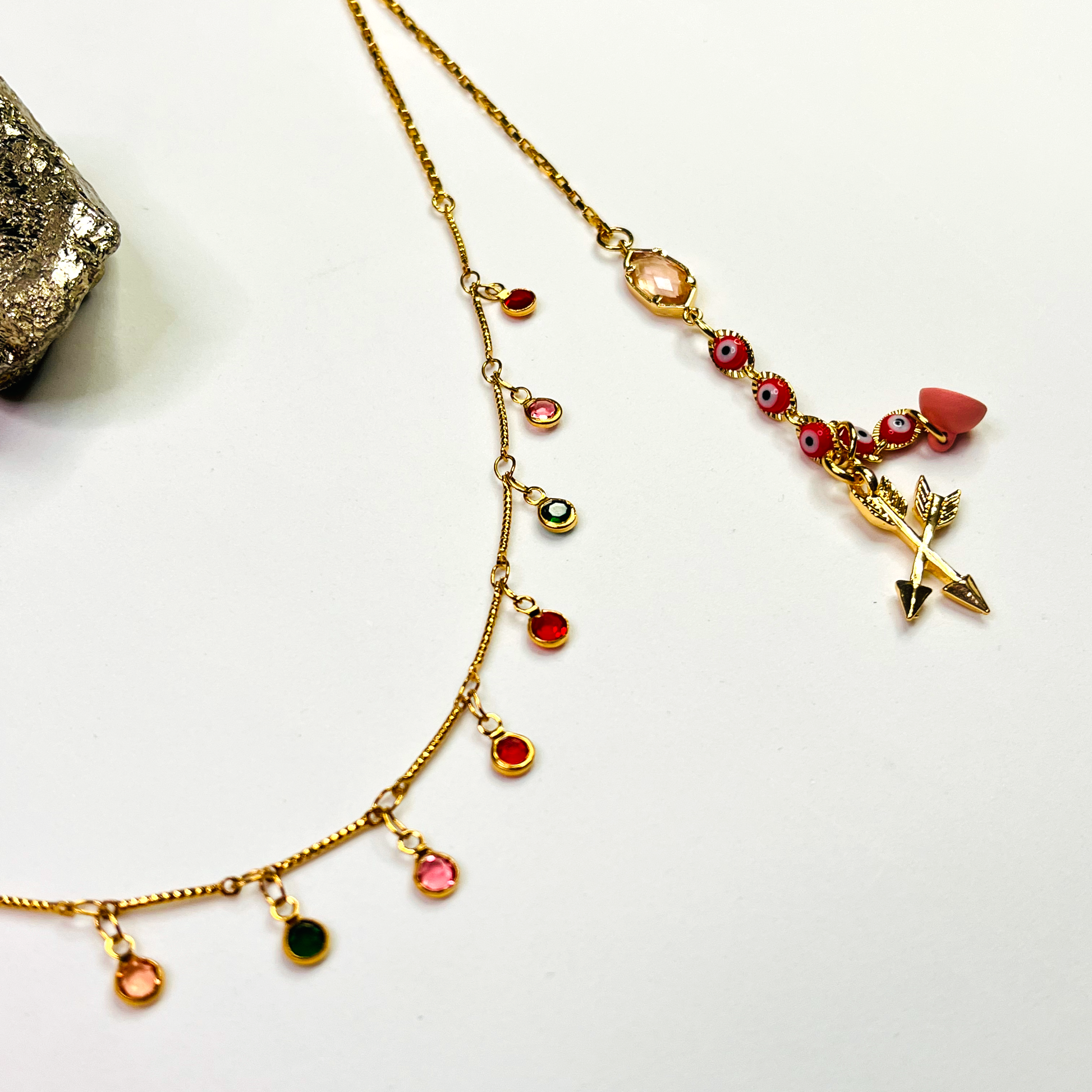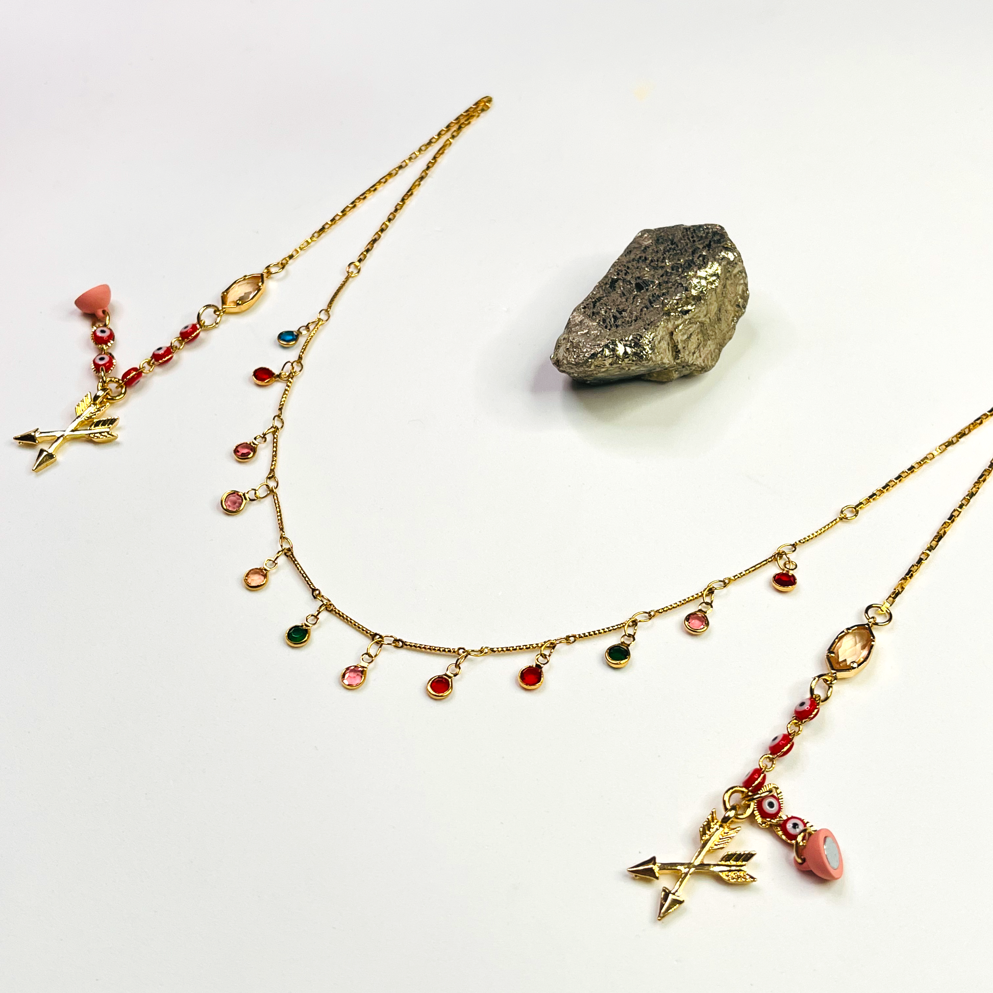 Frente de círculos colgantes de colores, Ojo turko rojo y colgantes con simbolo de LAS JARAS