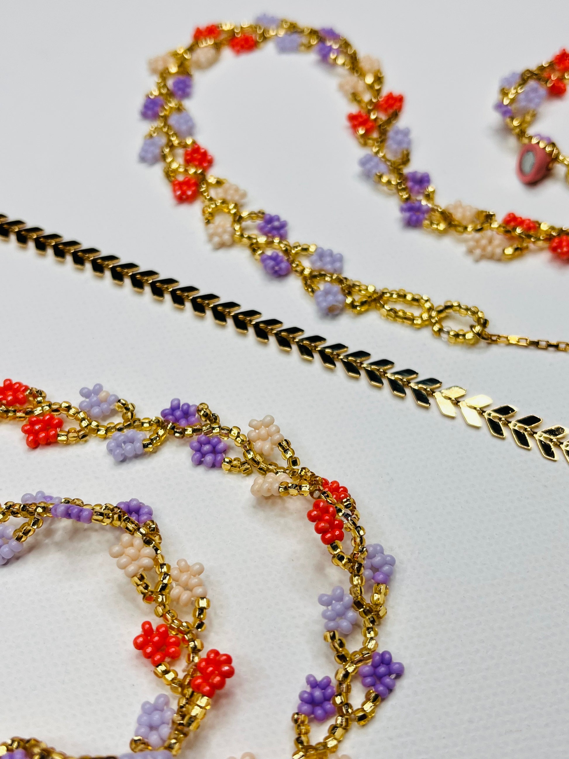 Cadena de cara en forma de flecha con pendientes extra largos de chaquira bordada a mano en forma de flores.