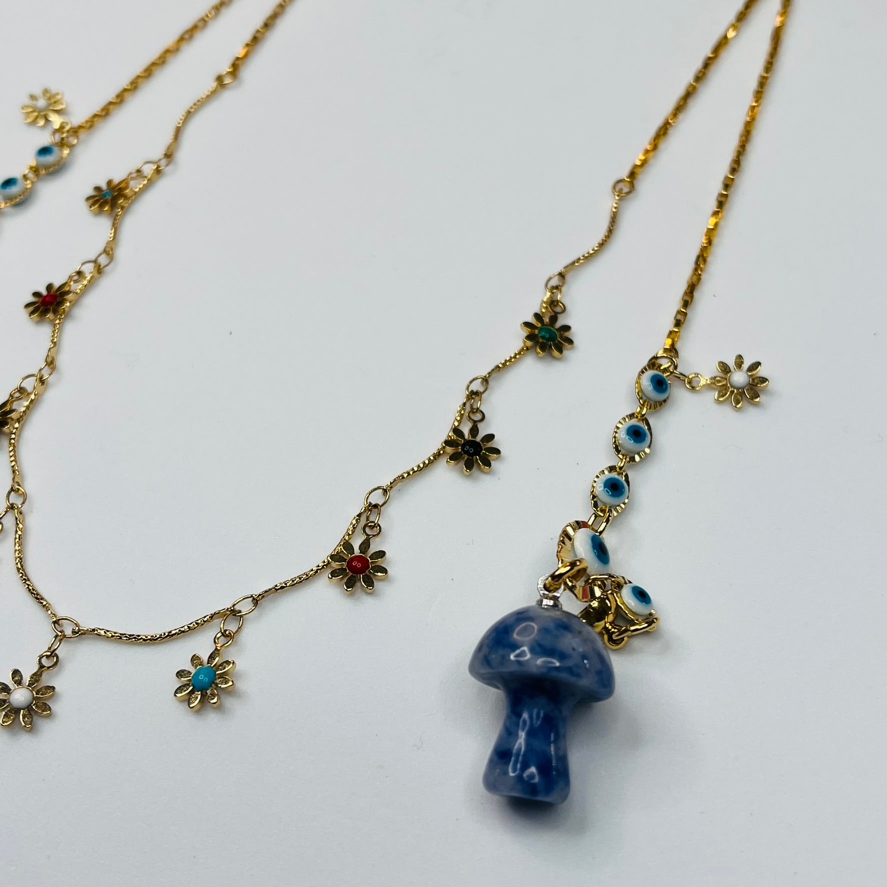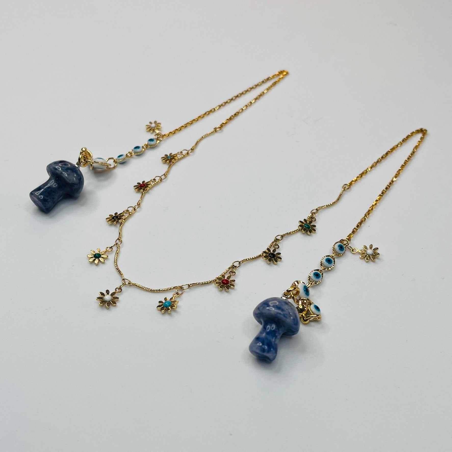Material: Aluminio con baño de oro 14k con cuarzo sodalita en forma de hongo.
