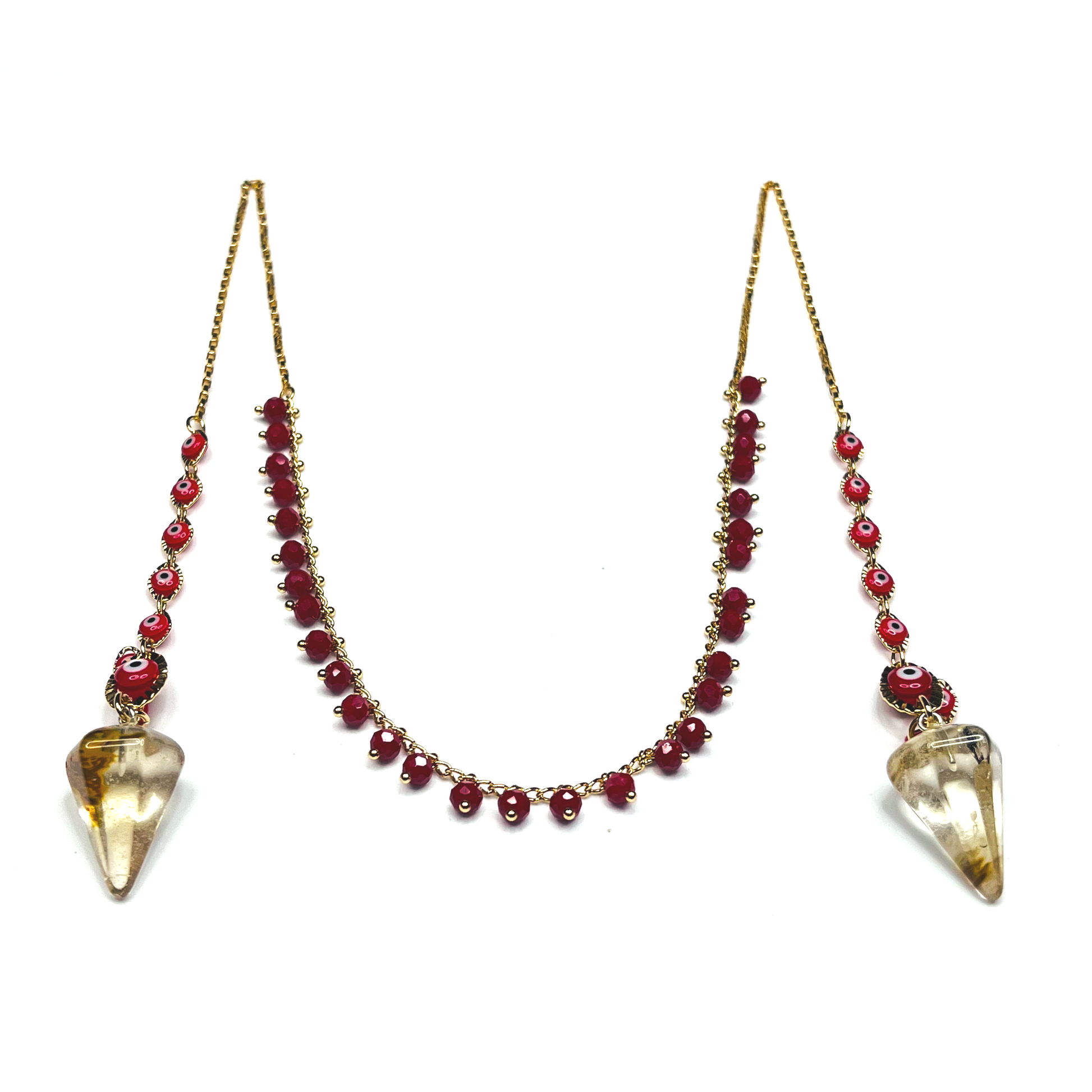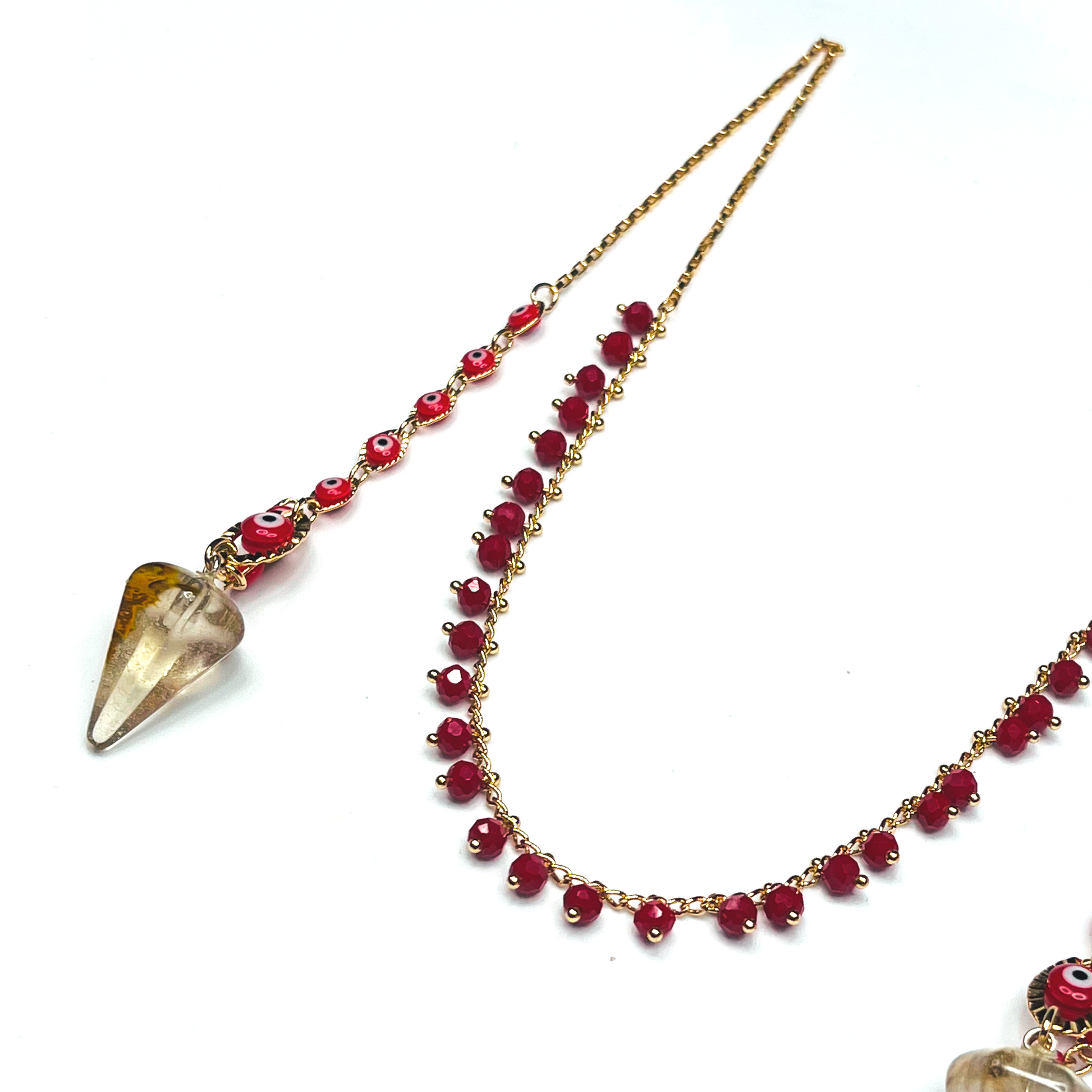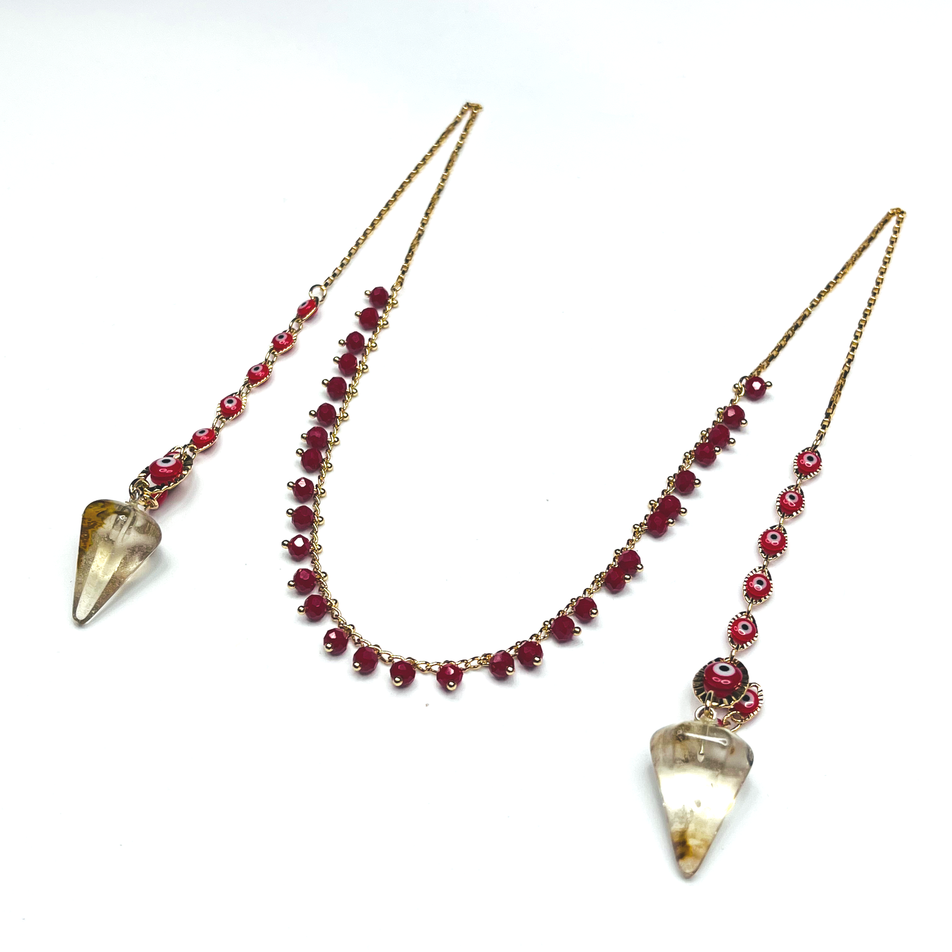 Cadena de cuencas colgantes con ojos turcos rojo y cuarzo lodolita.