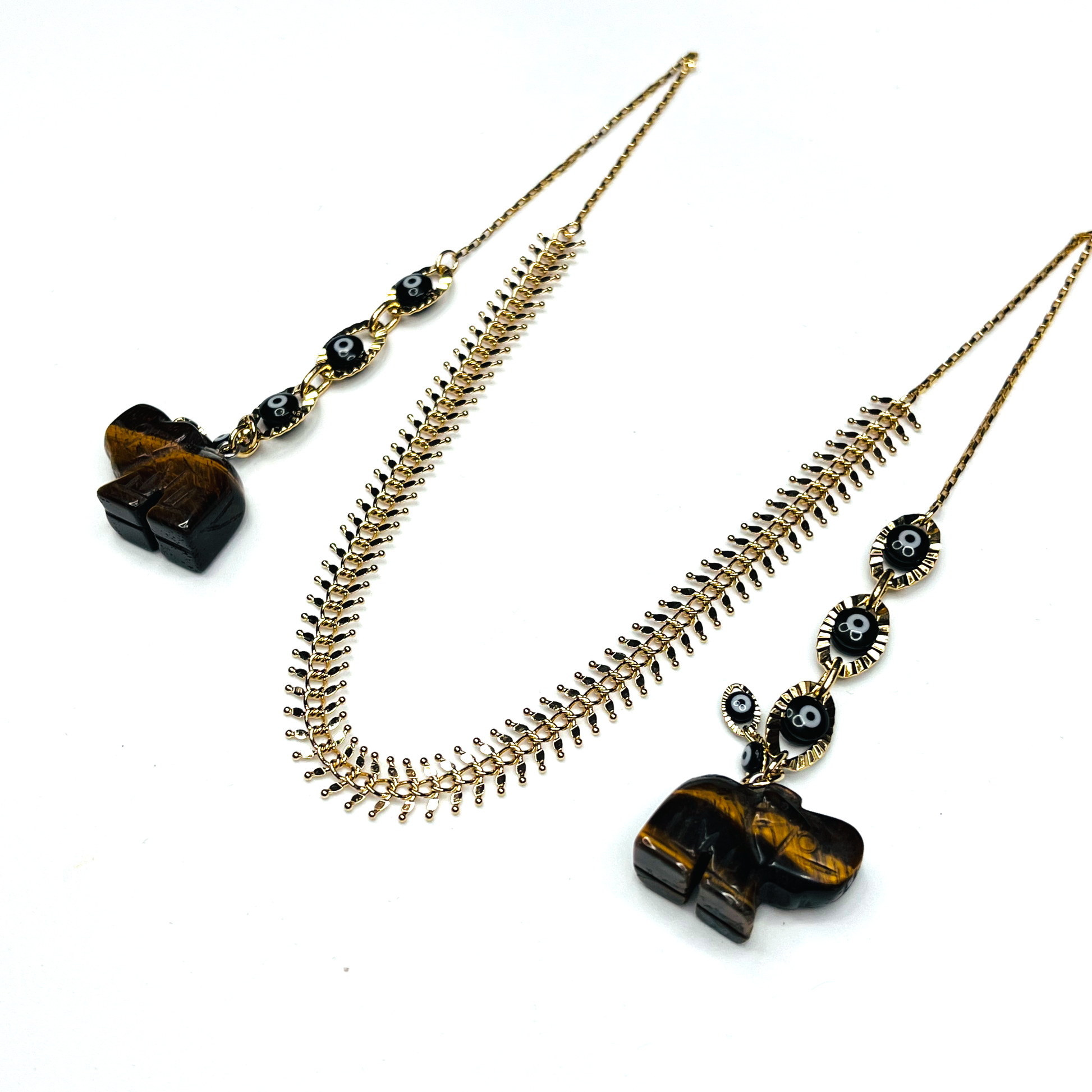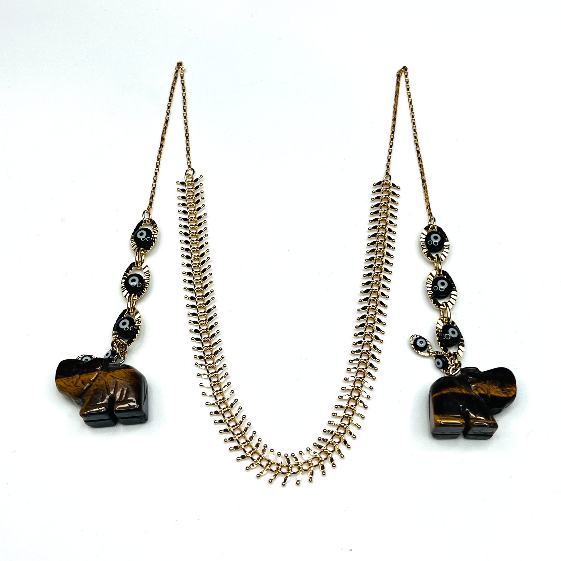 Cadena en forma de serpiente con ojos turcos negro y cuarzo Ojo de Tigre en forma de elefante.