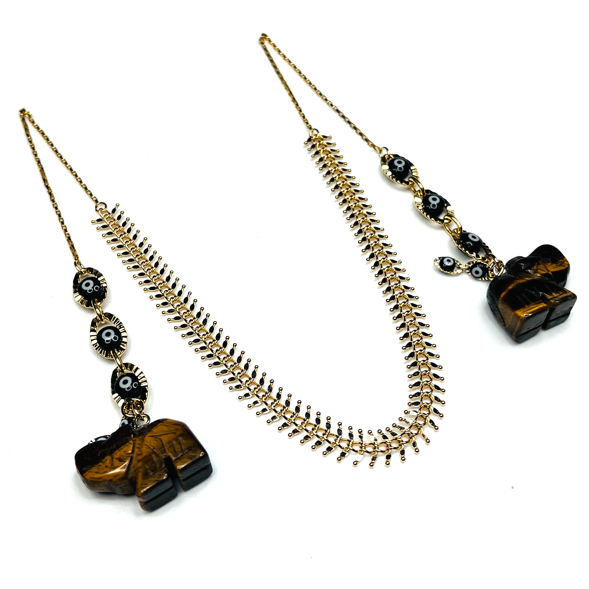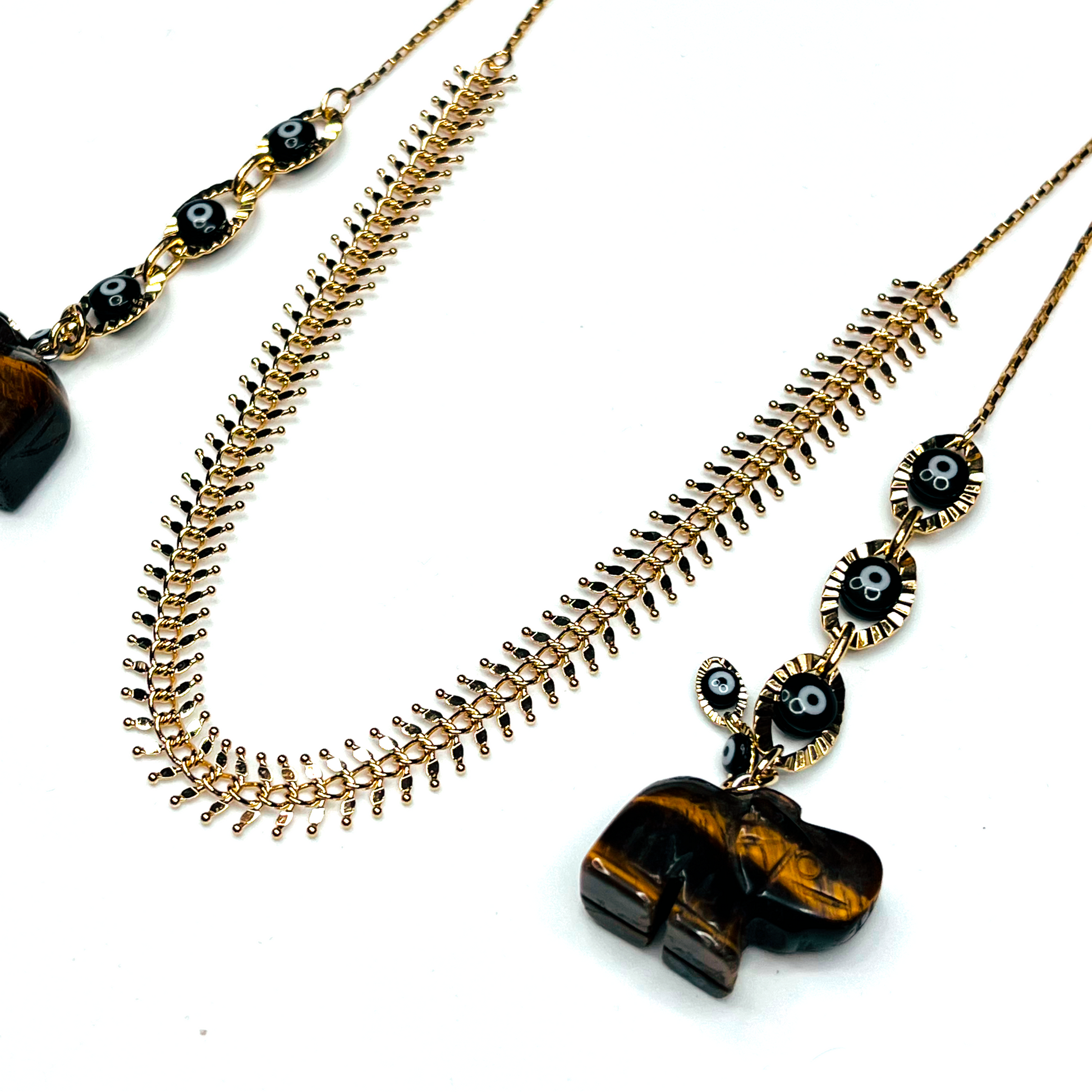 Snake Chain with Turkish Eyes, & Eye Tiger quartz elephants.