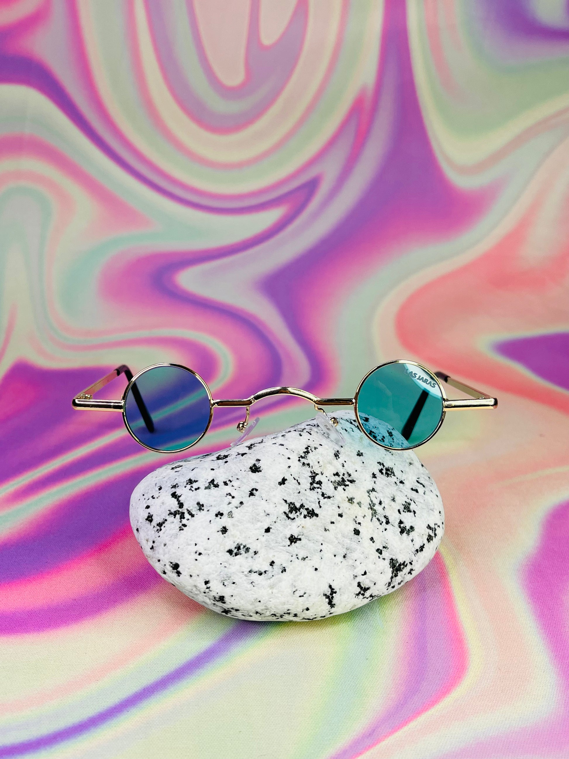 Gafas de sol mini en forma circular con marco dorado.