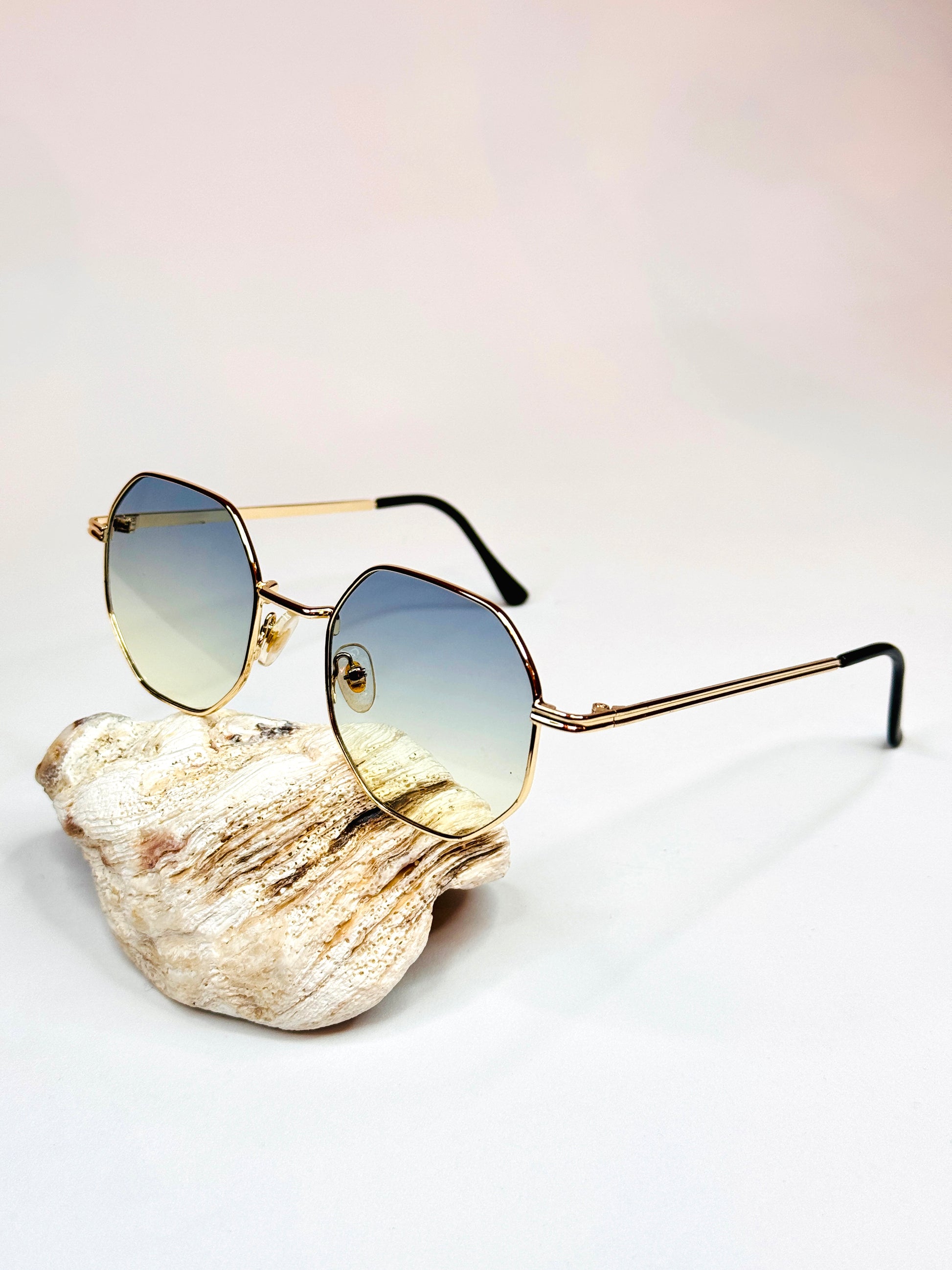 Gafas de sol en color dorado tipo vintage, en forma hexagonal con micas tintadas en color azul gris.