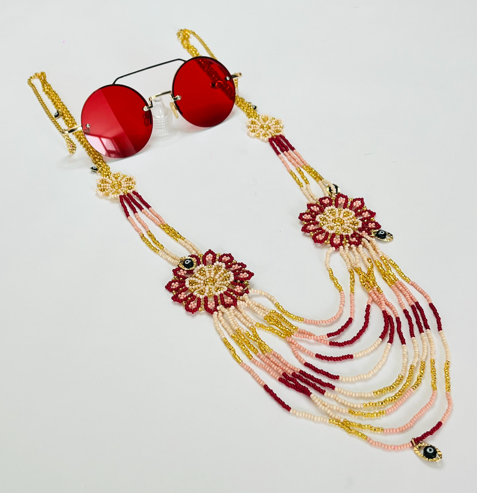 Red Sunglasses with a handmade necklace.