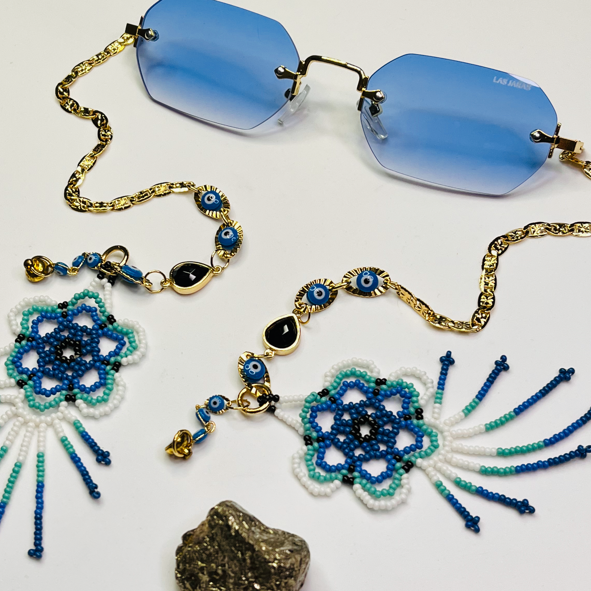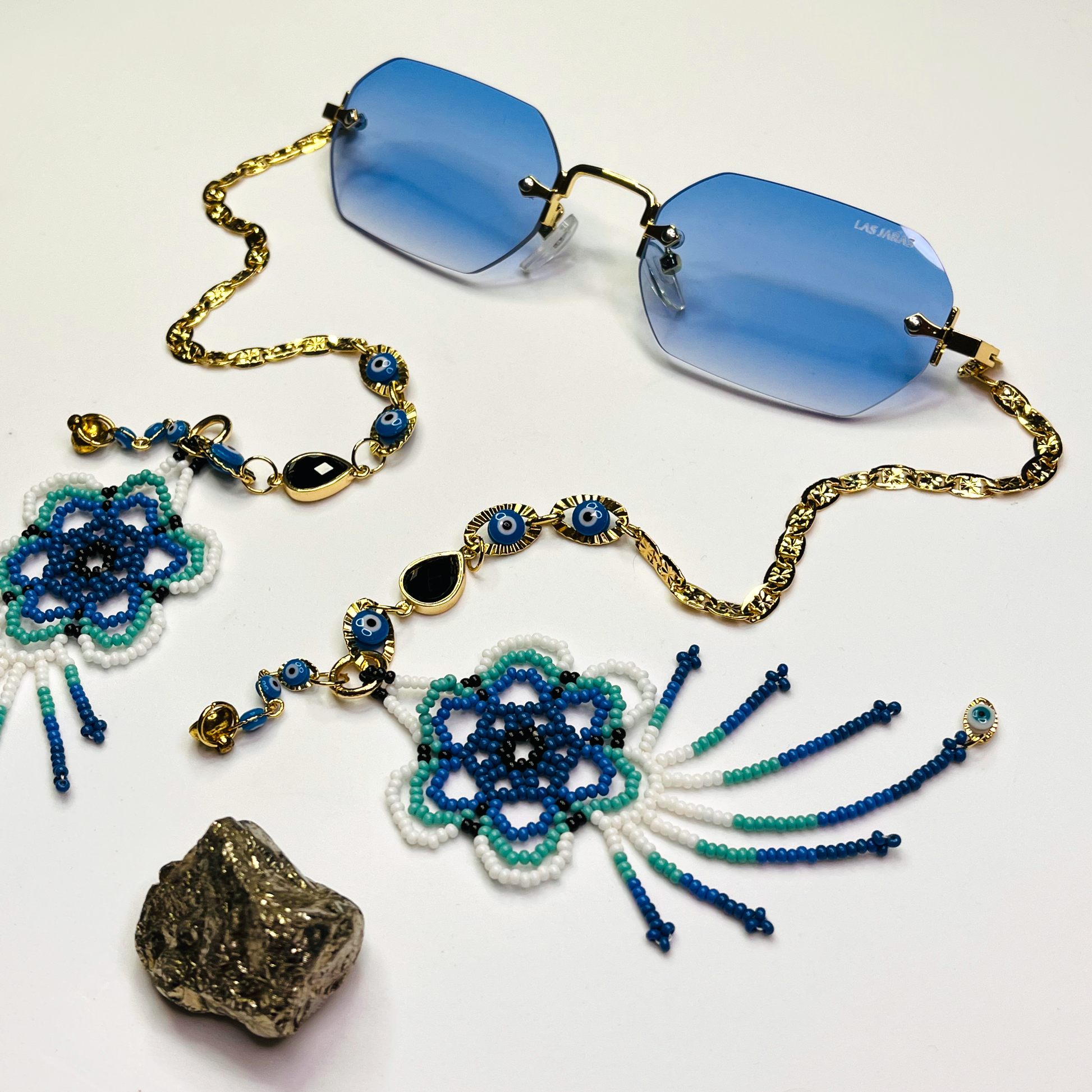 Gafas azules en forma de rectángulo, cadenas bañadas en oro de 14k, onix y flores de chaquira bordadas a mano.