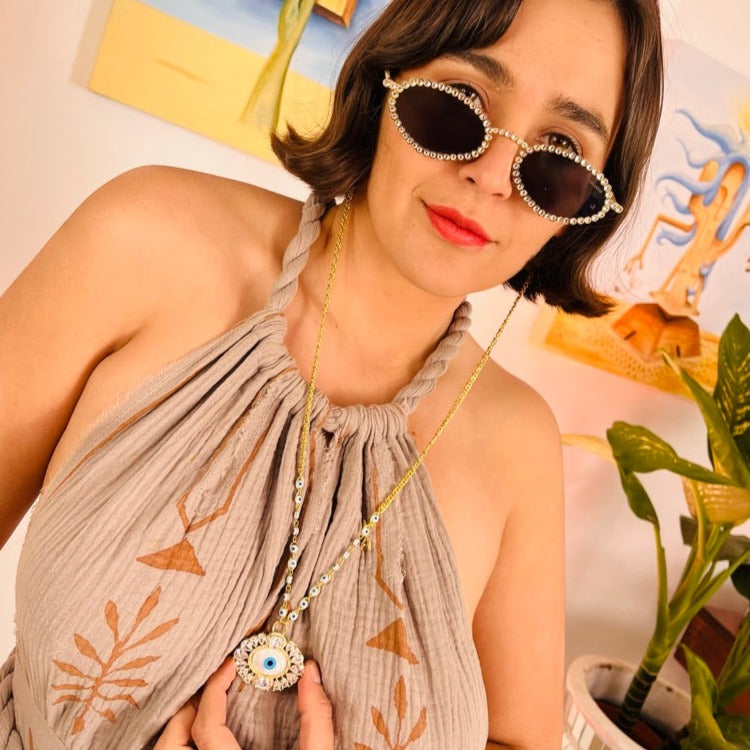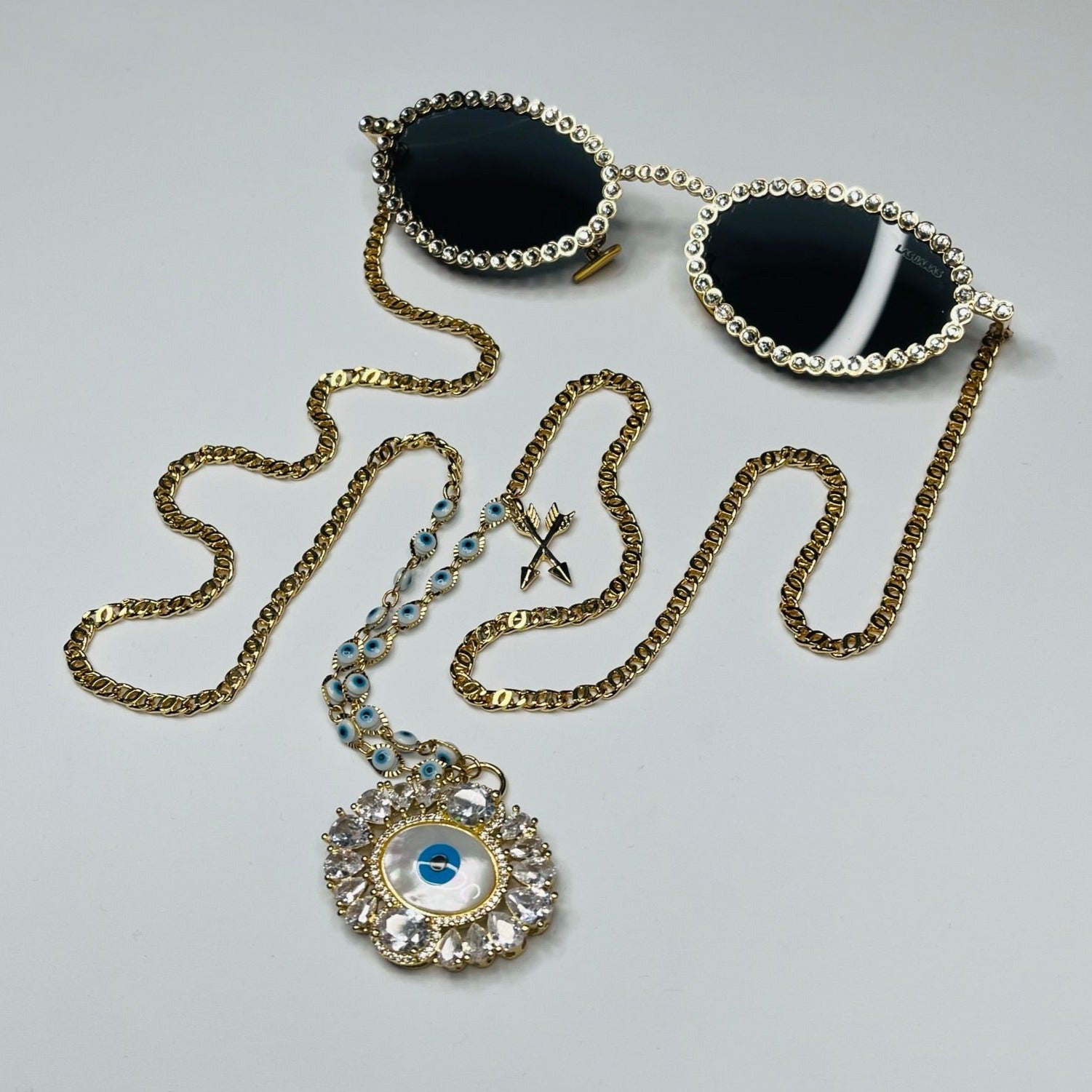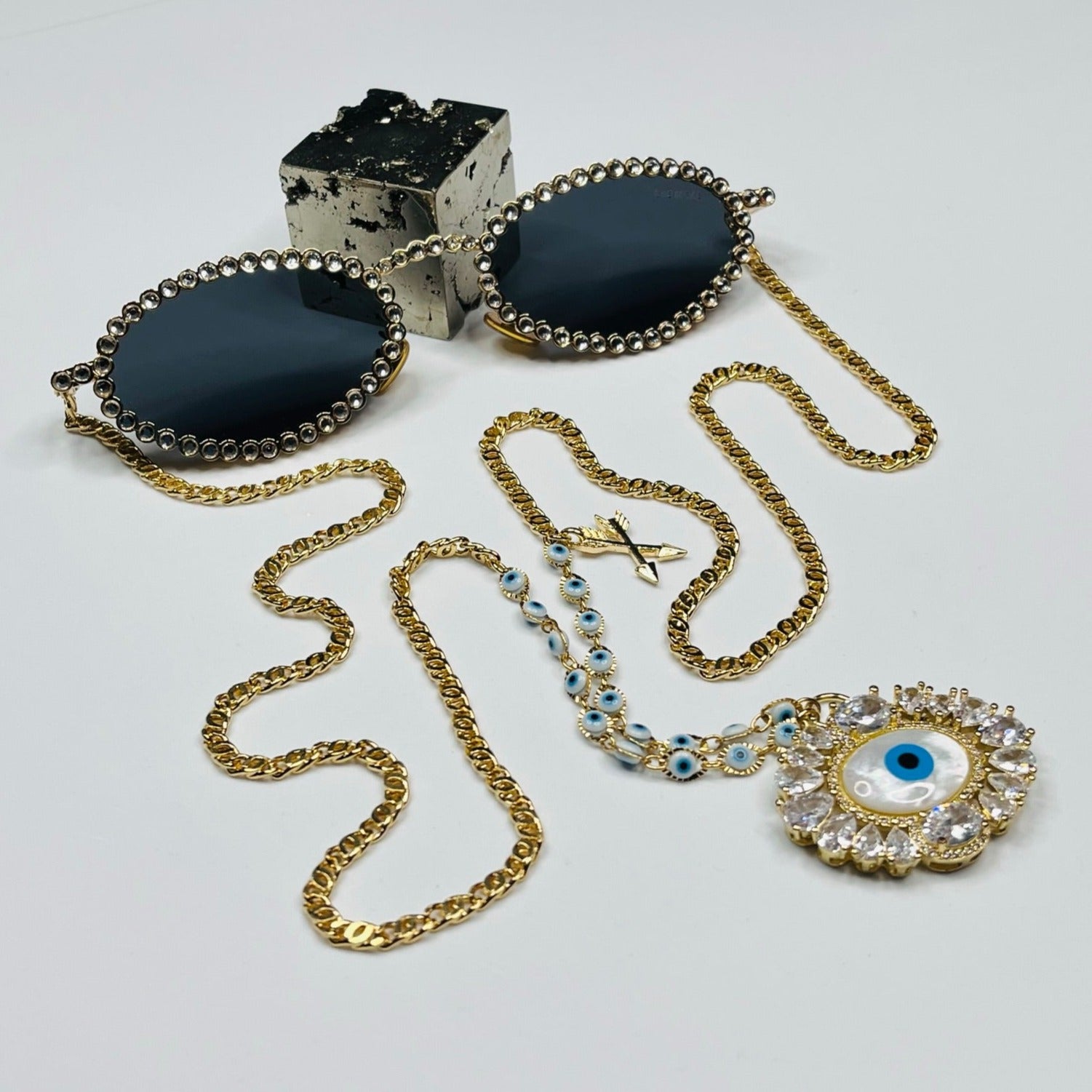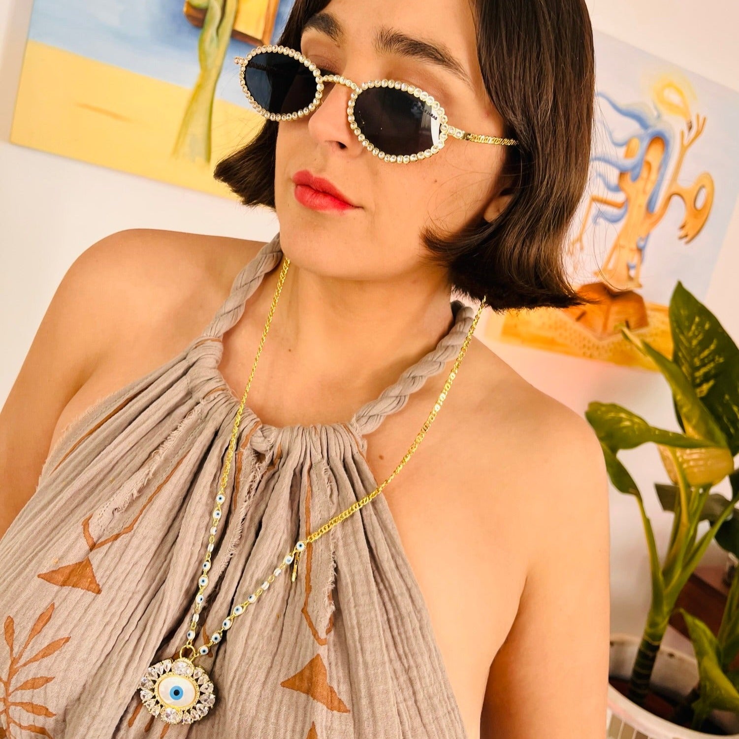Gafas de sol ovaladas en color negro con collar de madre perla con incrustaciones de zirconia.