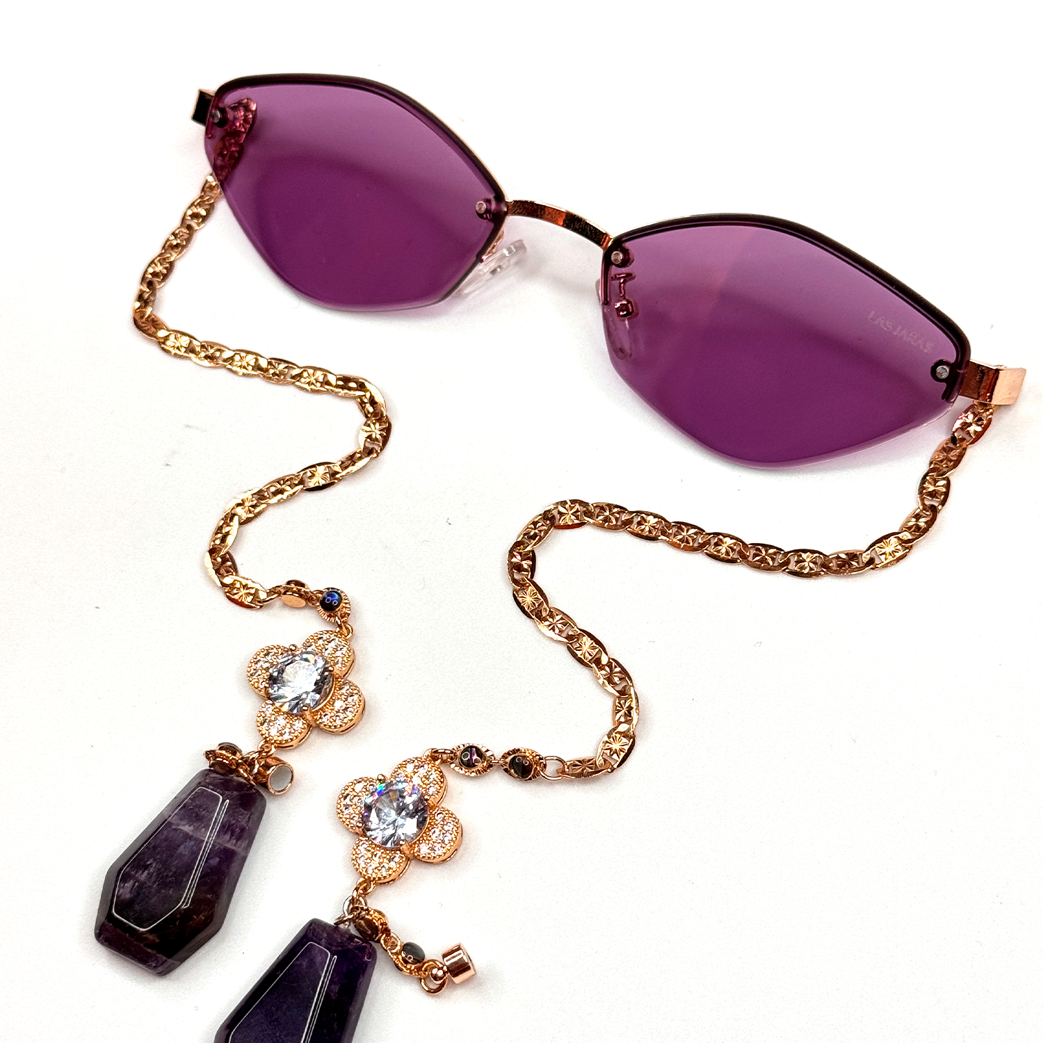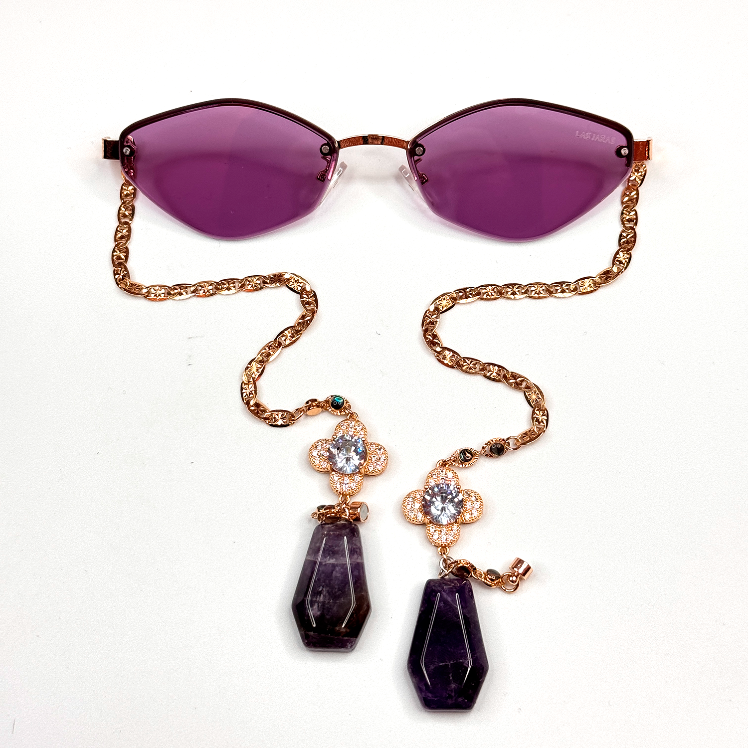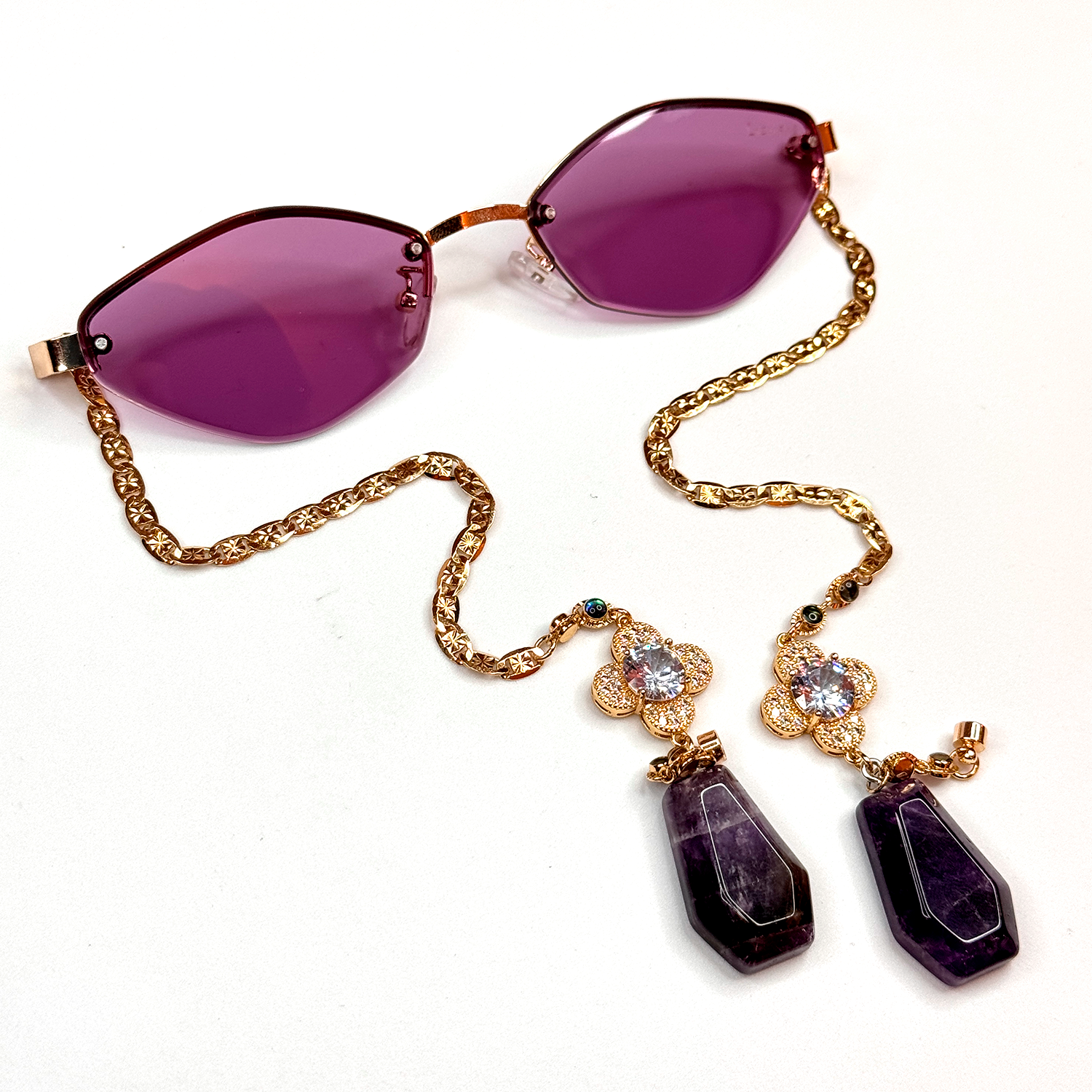 Purple cat eye-shaped sunglasses with 14k gold-plated chains with zircone flowers in the middle and amethyst quartz ends.