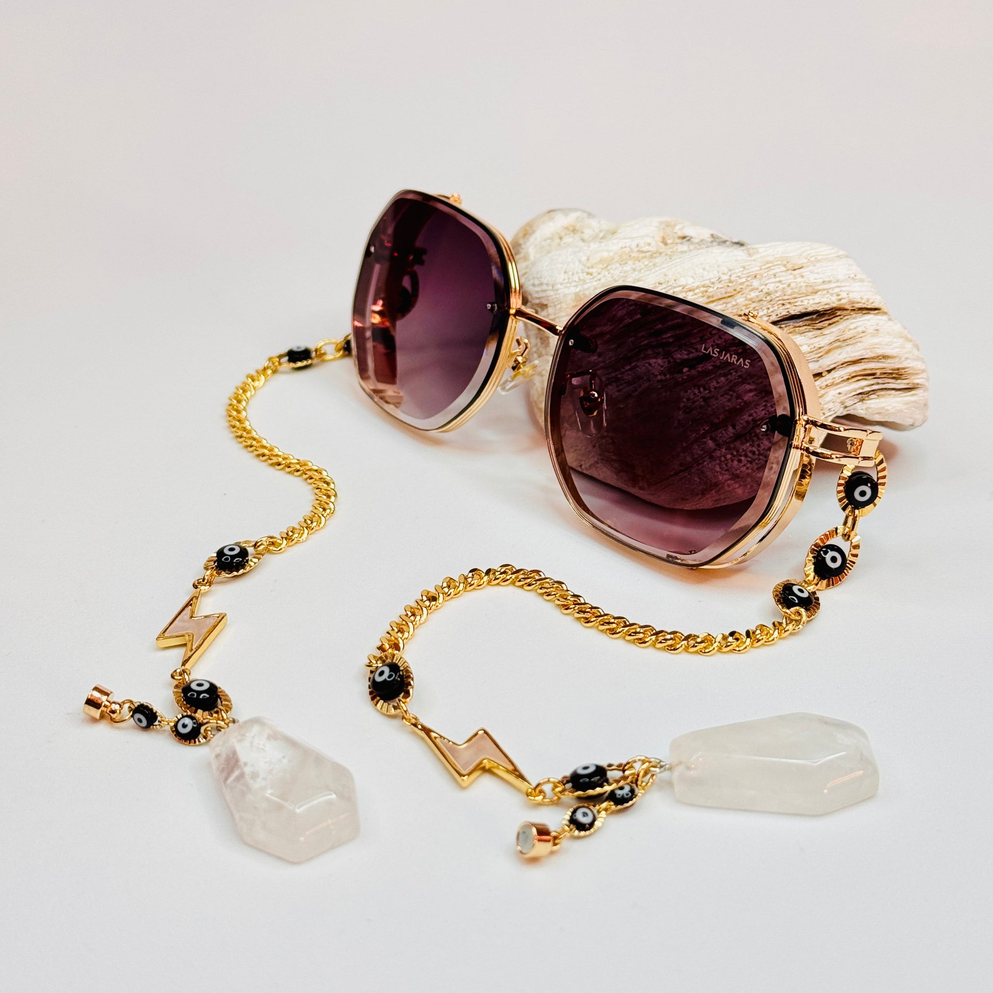 Black Square sunglasses with 14k gold-plated chains with black turkish eyes in the middle and white quartz ends.