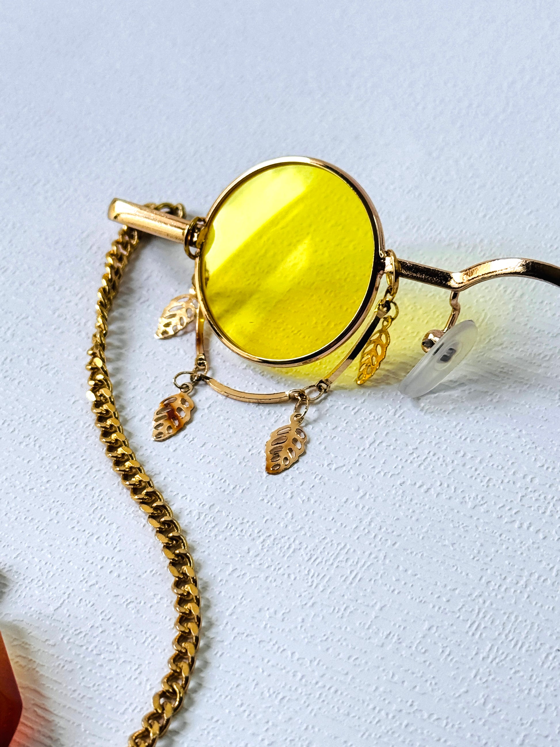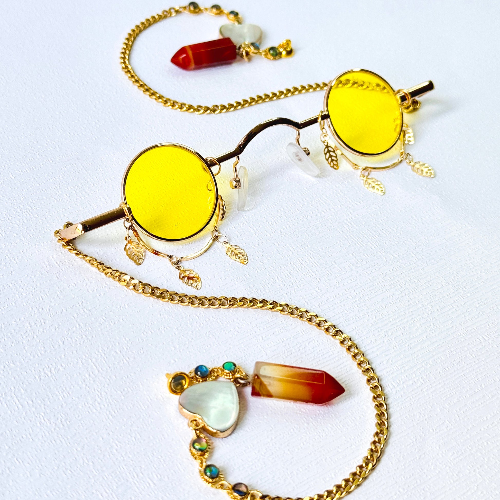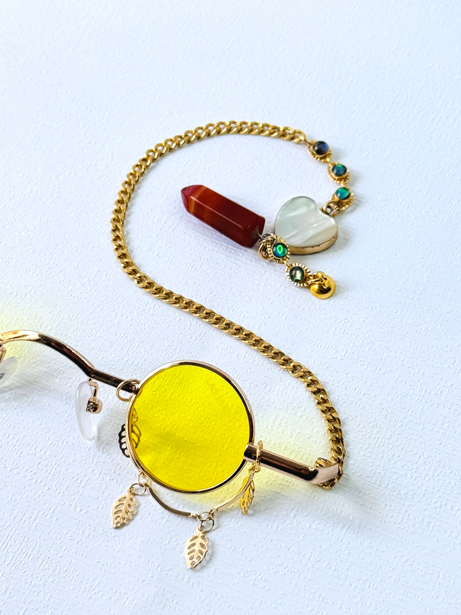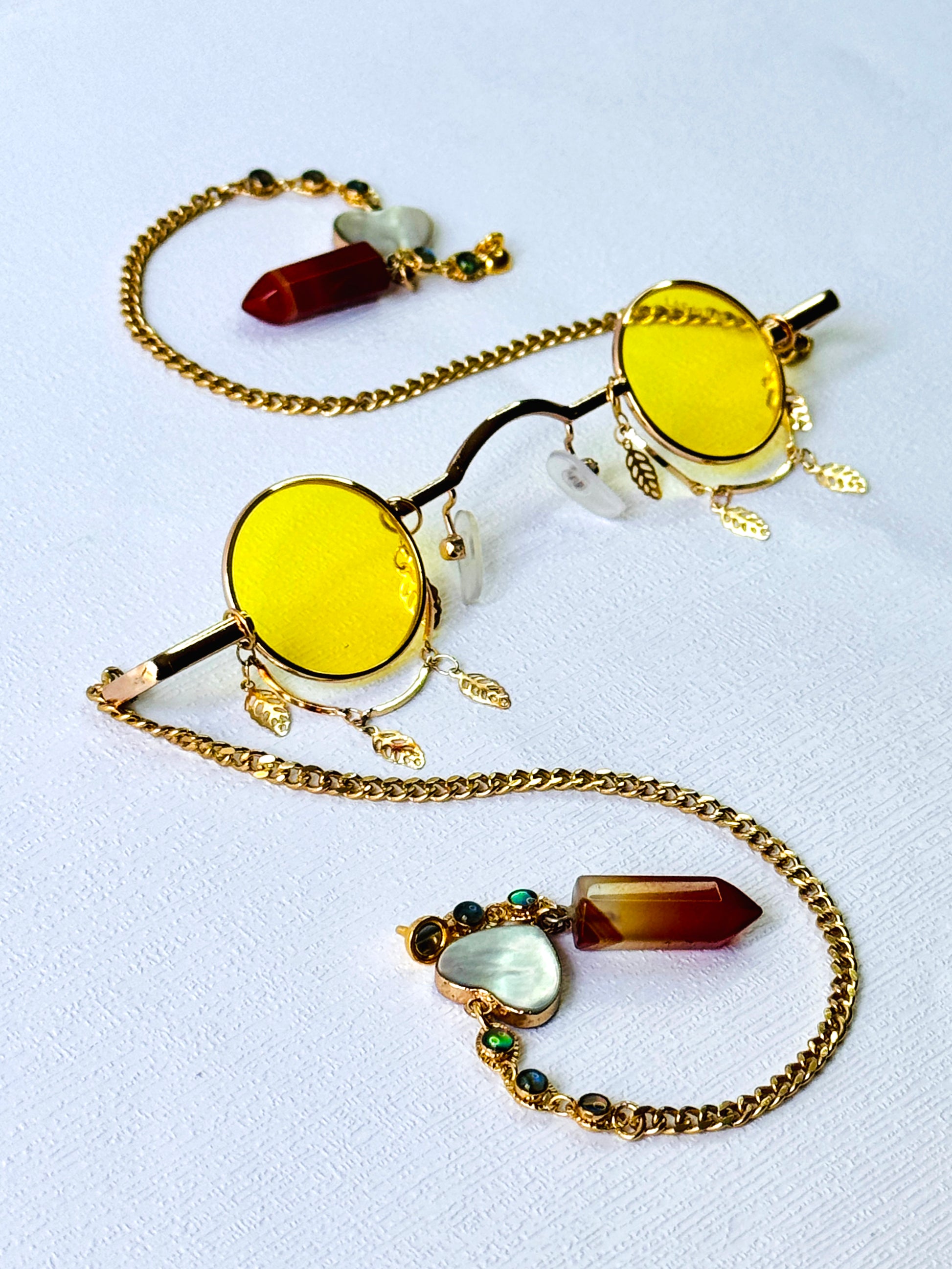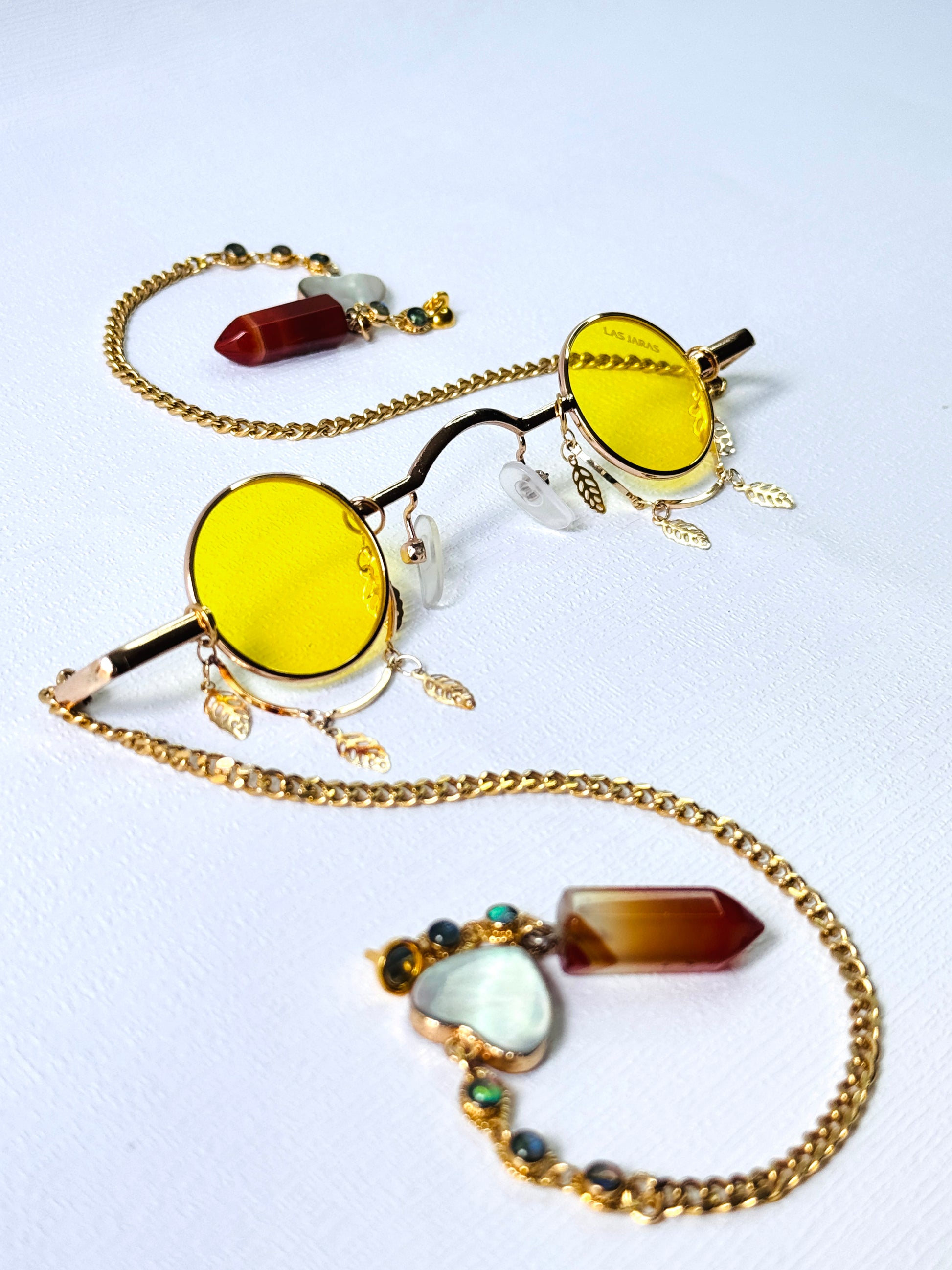 Yellow circle sunglasses with 14k gold-plated chains with avulon in the middle and cornaline quartz ends.