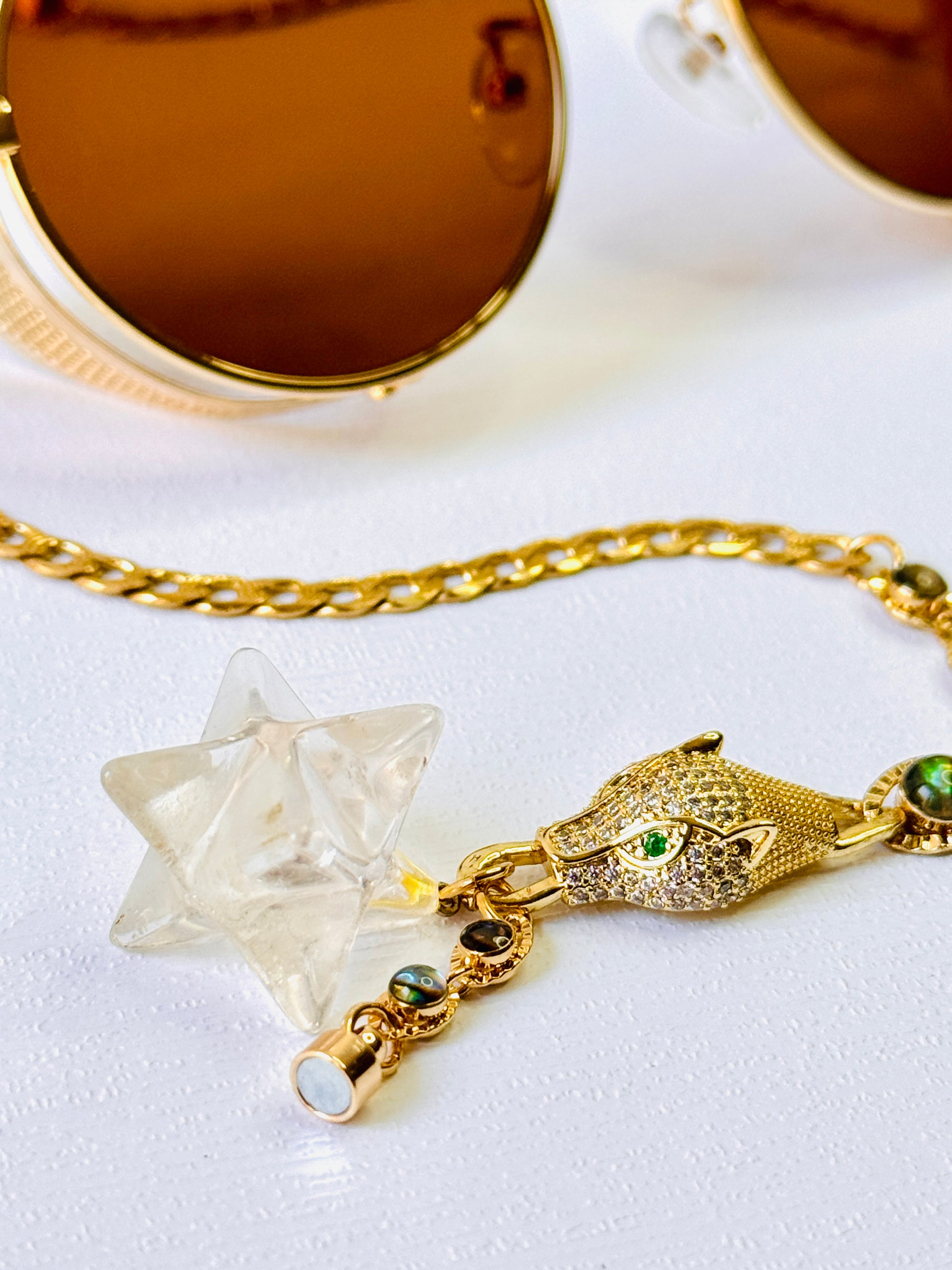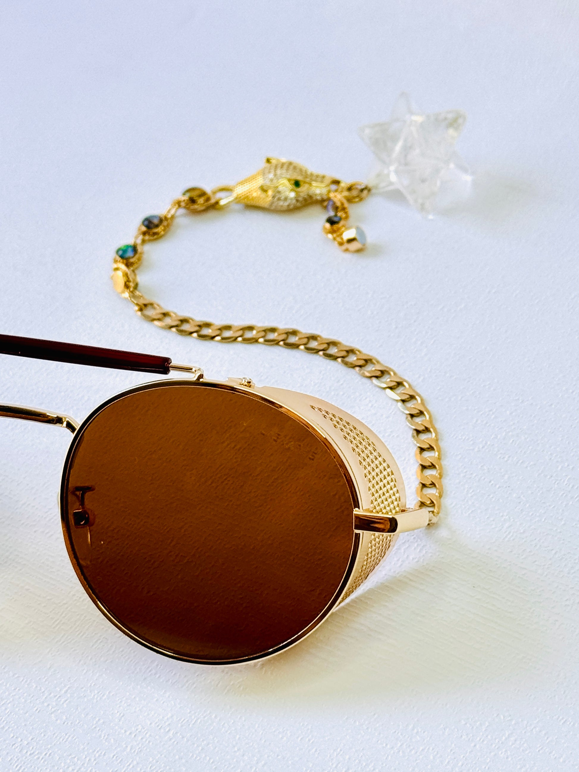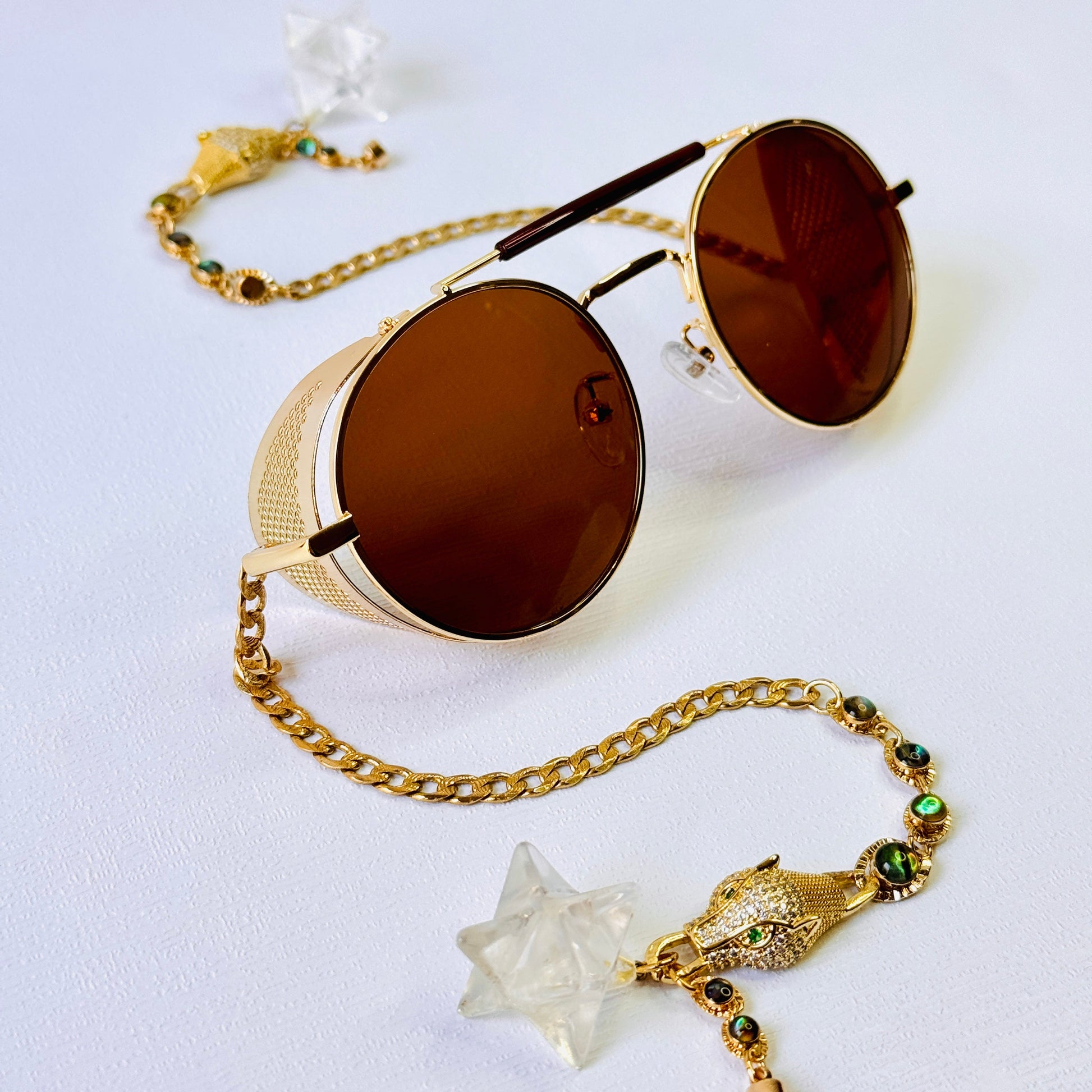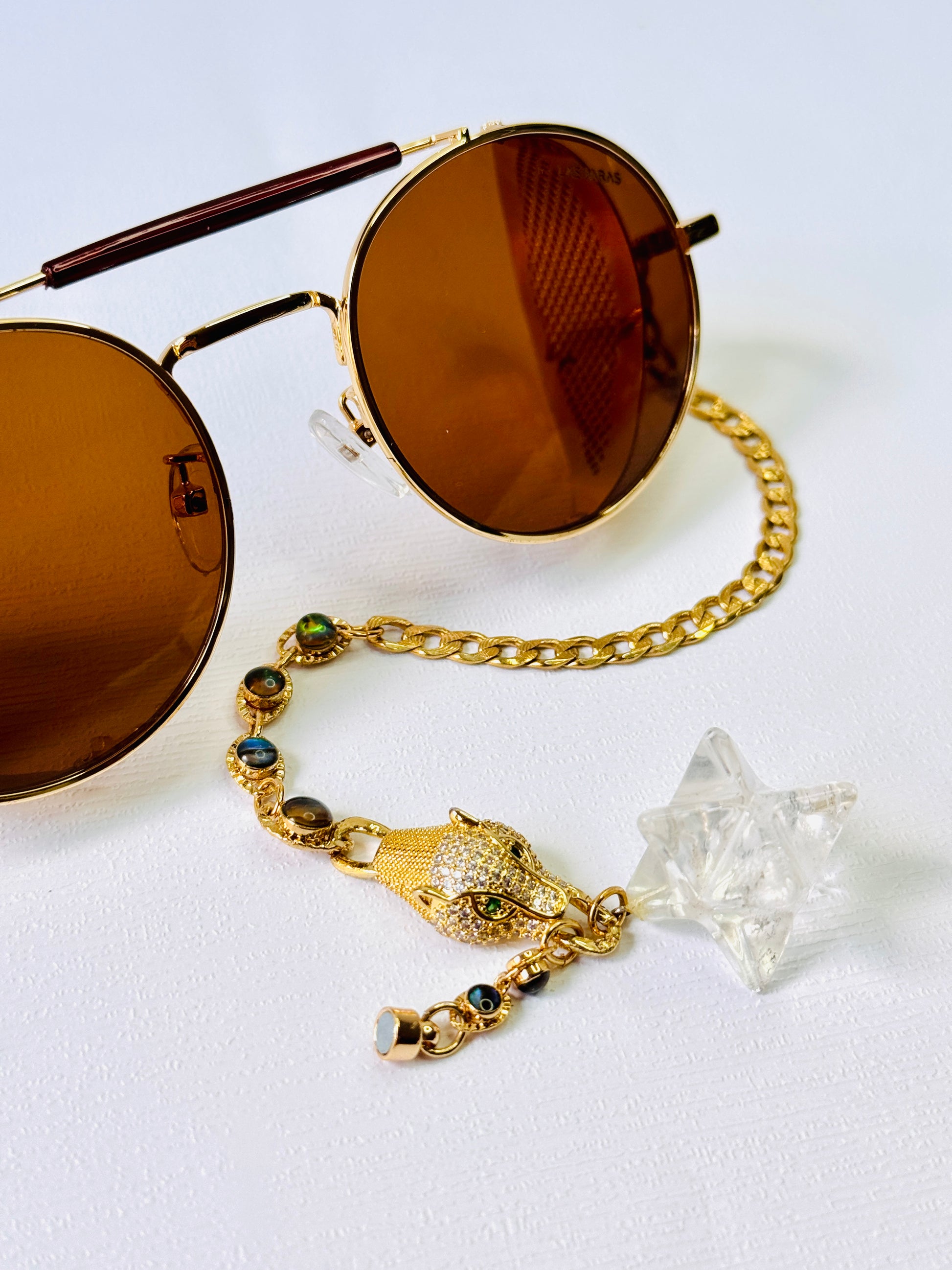 Brown circle sunglasses with 14k gold-plated chains with zircon jaguar in the middle and white merkaba quartz ends.