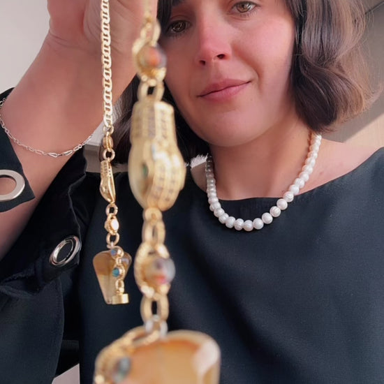 Round-shaped green sunglasses with 14k gold-plated chains with sneakes with zircon and lodolite quartz ends.