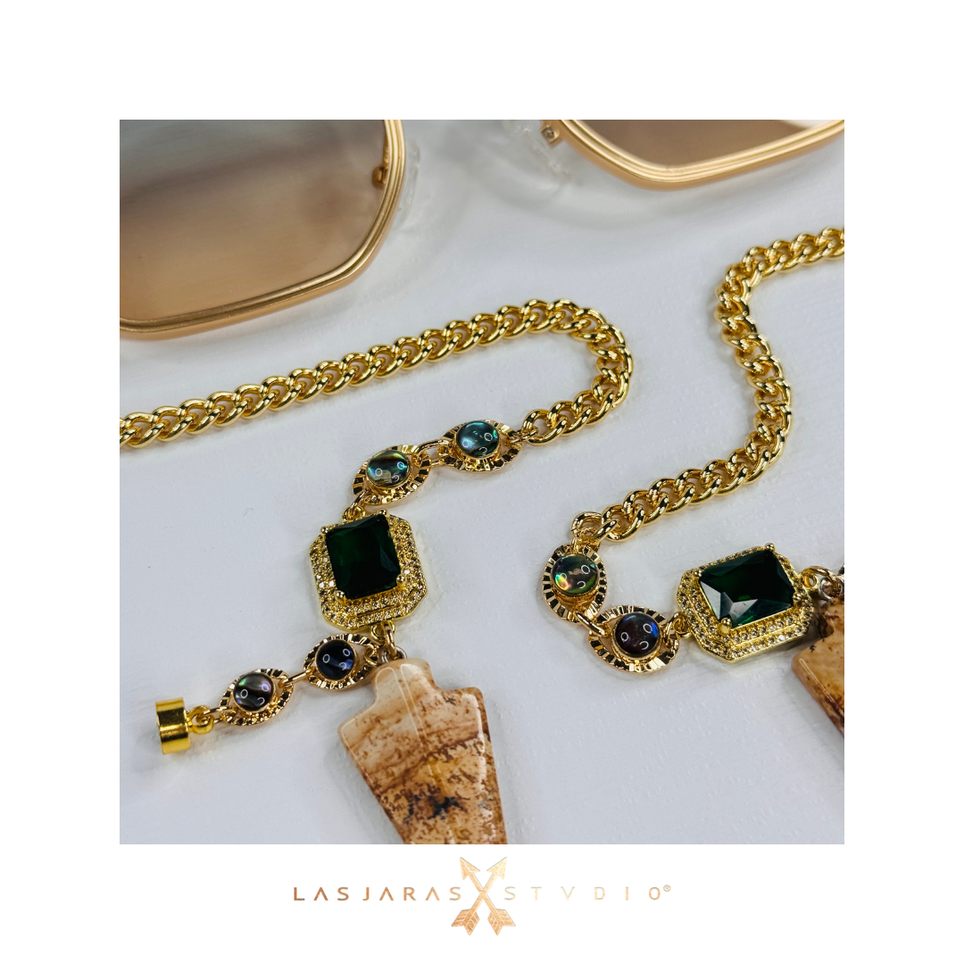 Square-shaped Gren/Yellow sunglasses with 14k gold-plated chains with Wood Jasper Quartz ends.