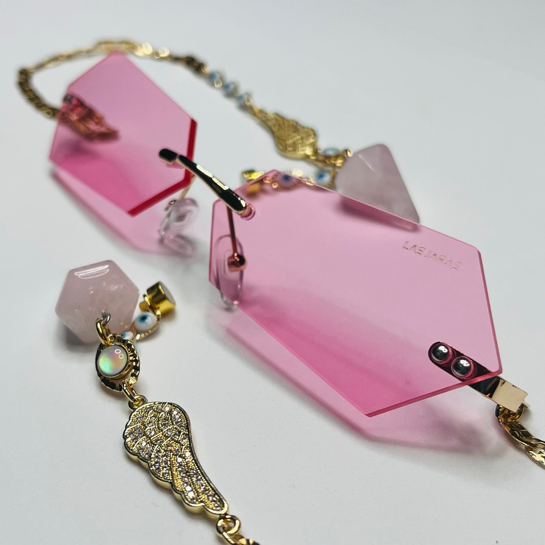 Gafas de sol color rosa con medios de alas de angel con incrustaciones de zirconia y cuarzo rosa.