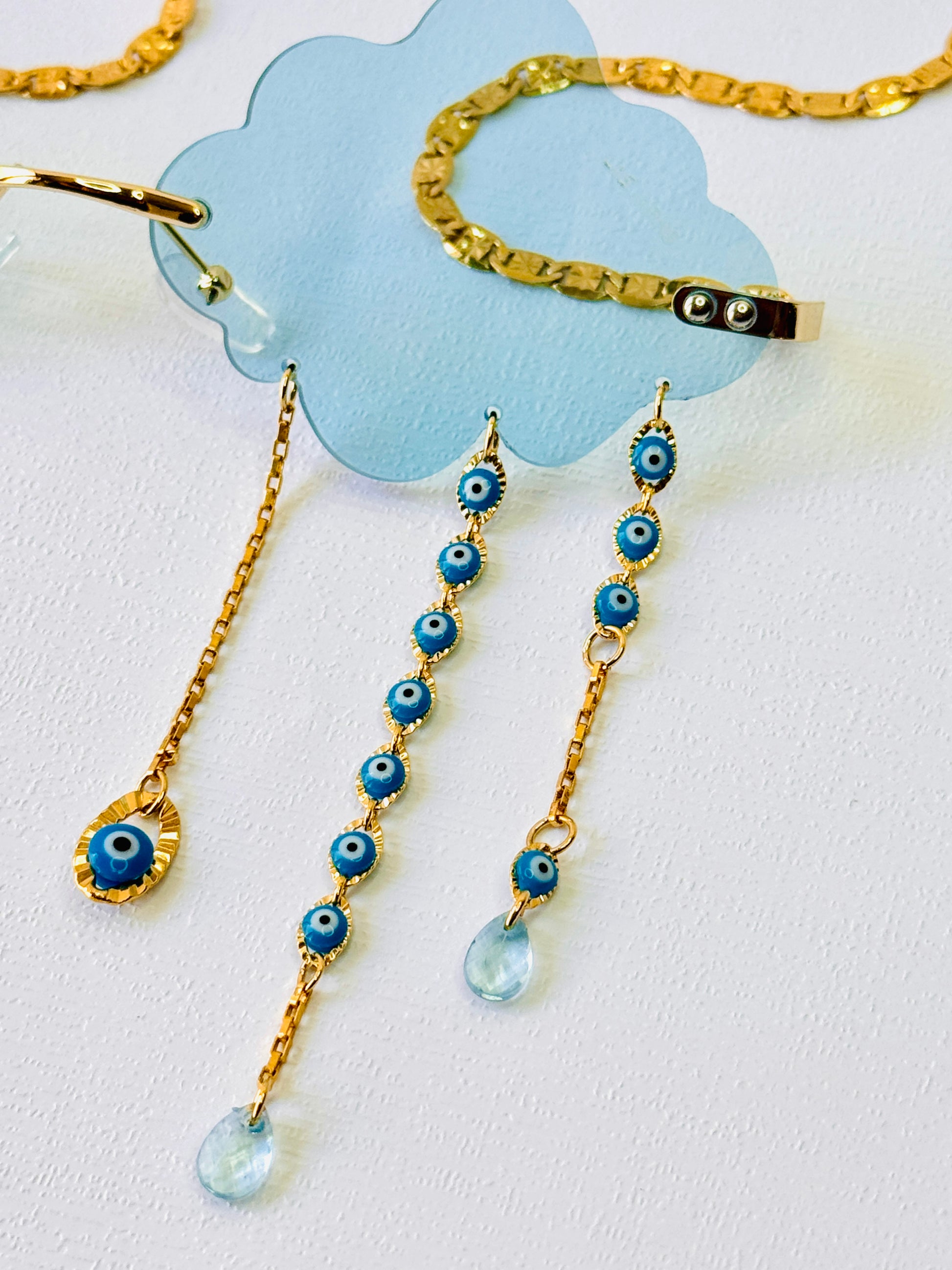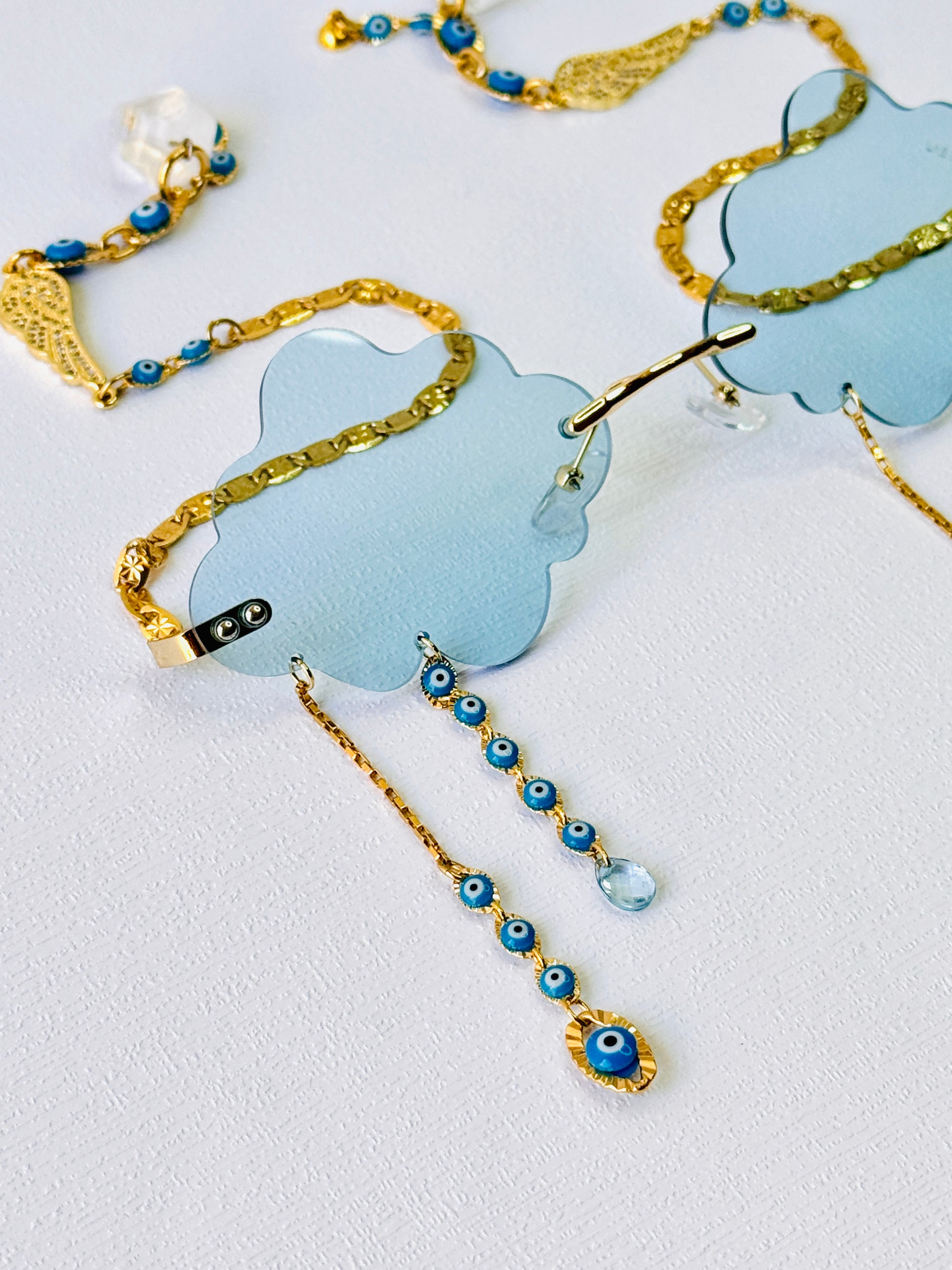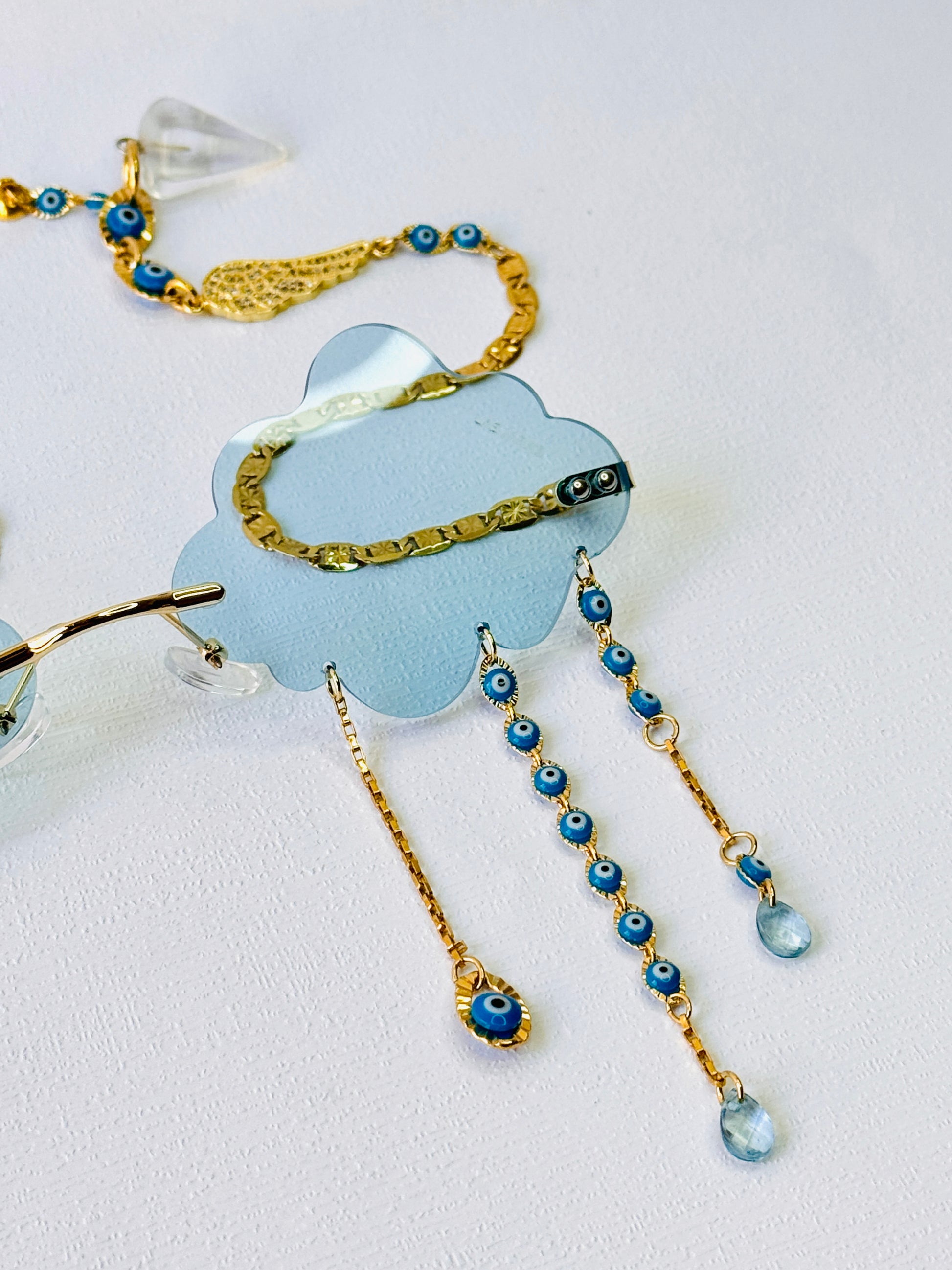 Cloud shape blue sunglasses with 14k gold-plated chains with a zircon angel wings in the middle and white quartz ends.