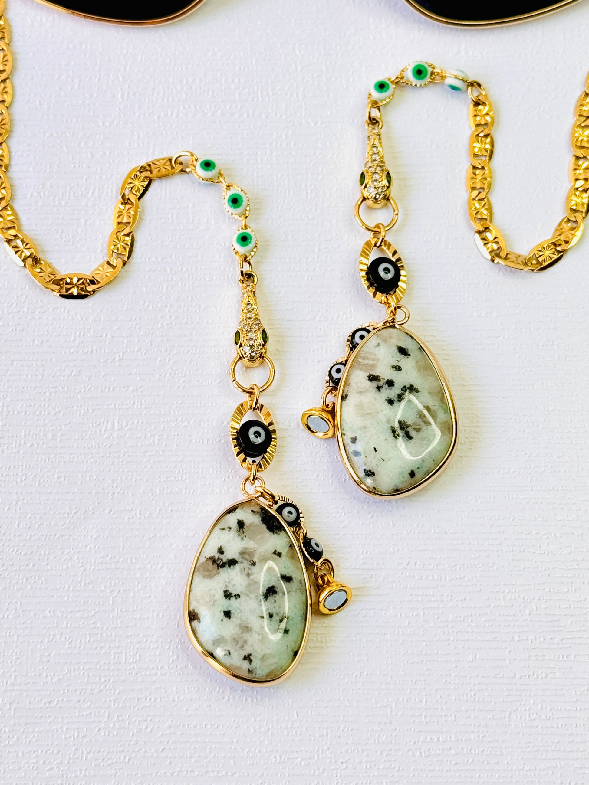 Black Aviator sunglasses with 14k gold-plated chains with a zircon sneake in the middle and kiwi jasper quartz ends.