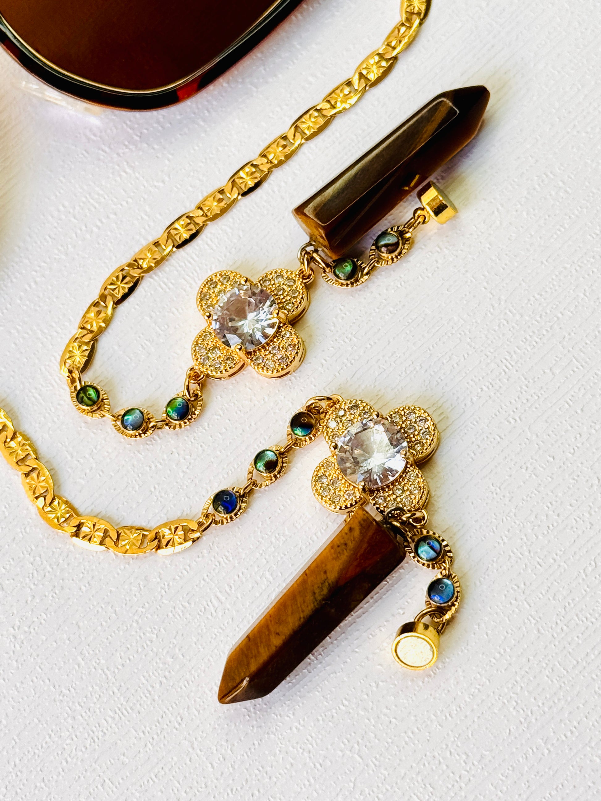 BRown and square sunglasses with 14k gold-plated chains with a zircon flower in the middle, and tiger eye quartz ends.