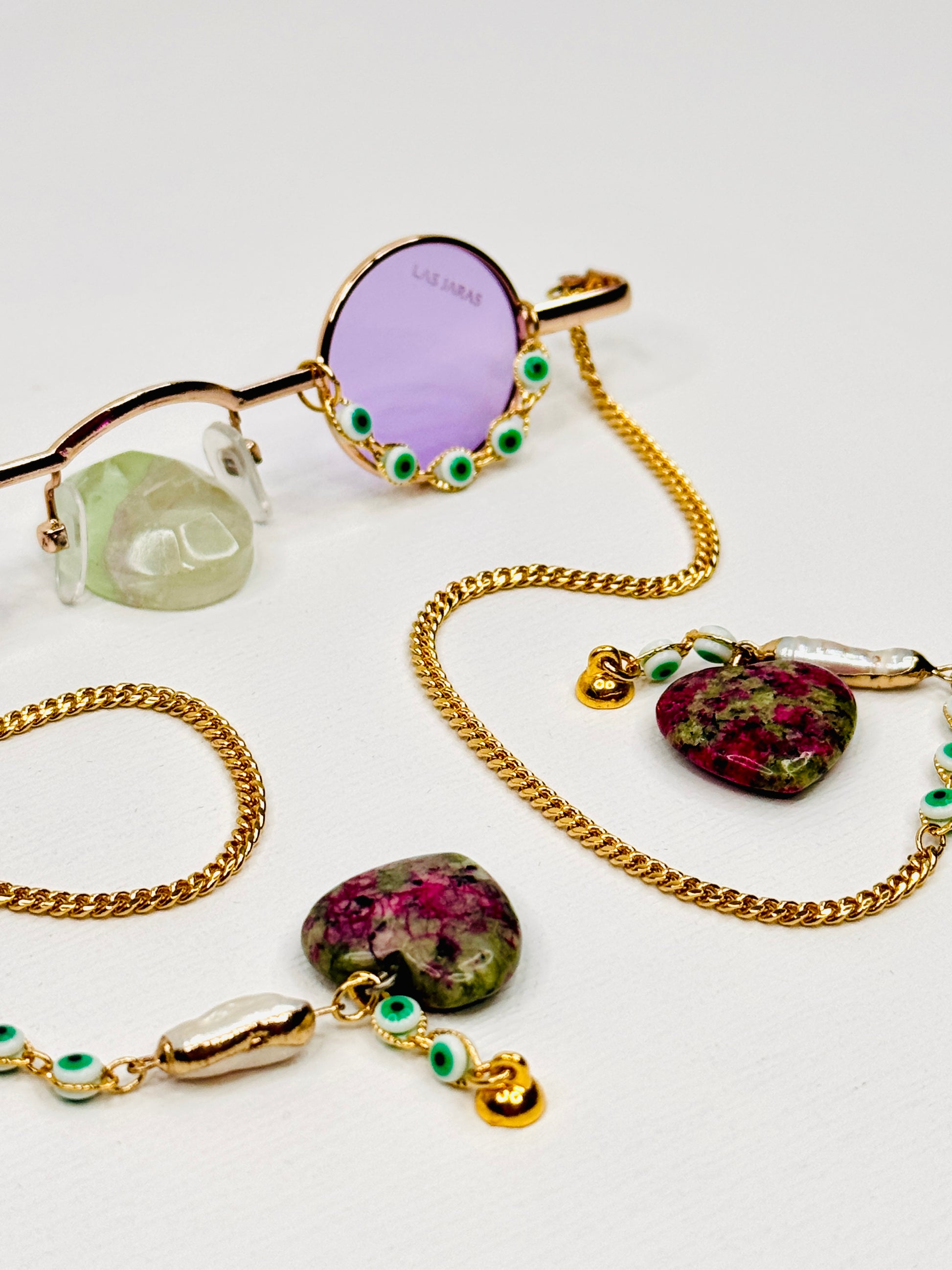 Gafas de sol en forma circular mini color morado con cadenas bañadas en oro de 14k, medios de ojo turco y perla natural, con cuarzo de sangre en forma de corazón.