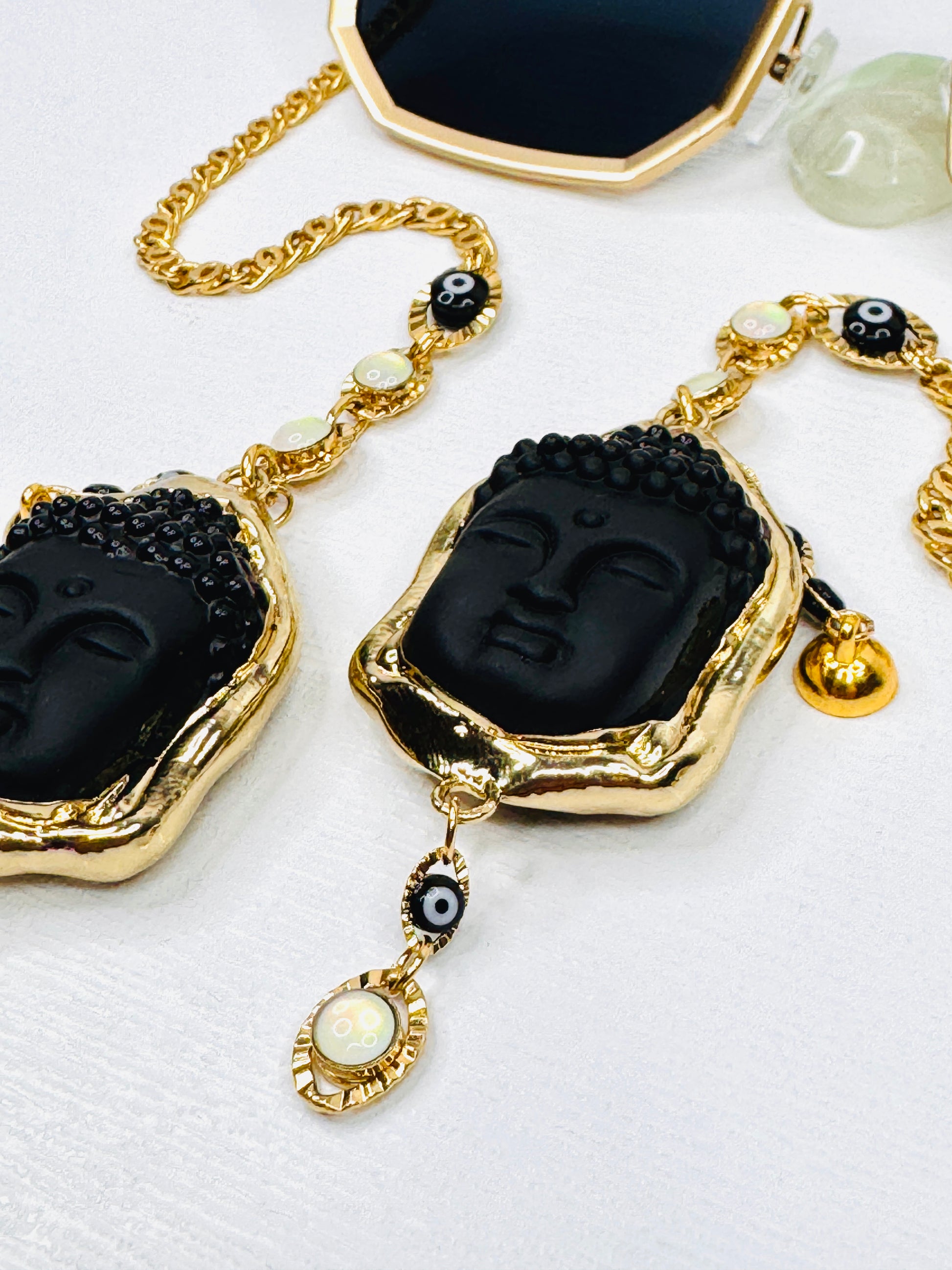 Square Black sunglasses with 14k gold-plated chains with black turkih eyes and ceramic Buda ends.