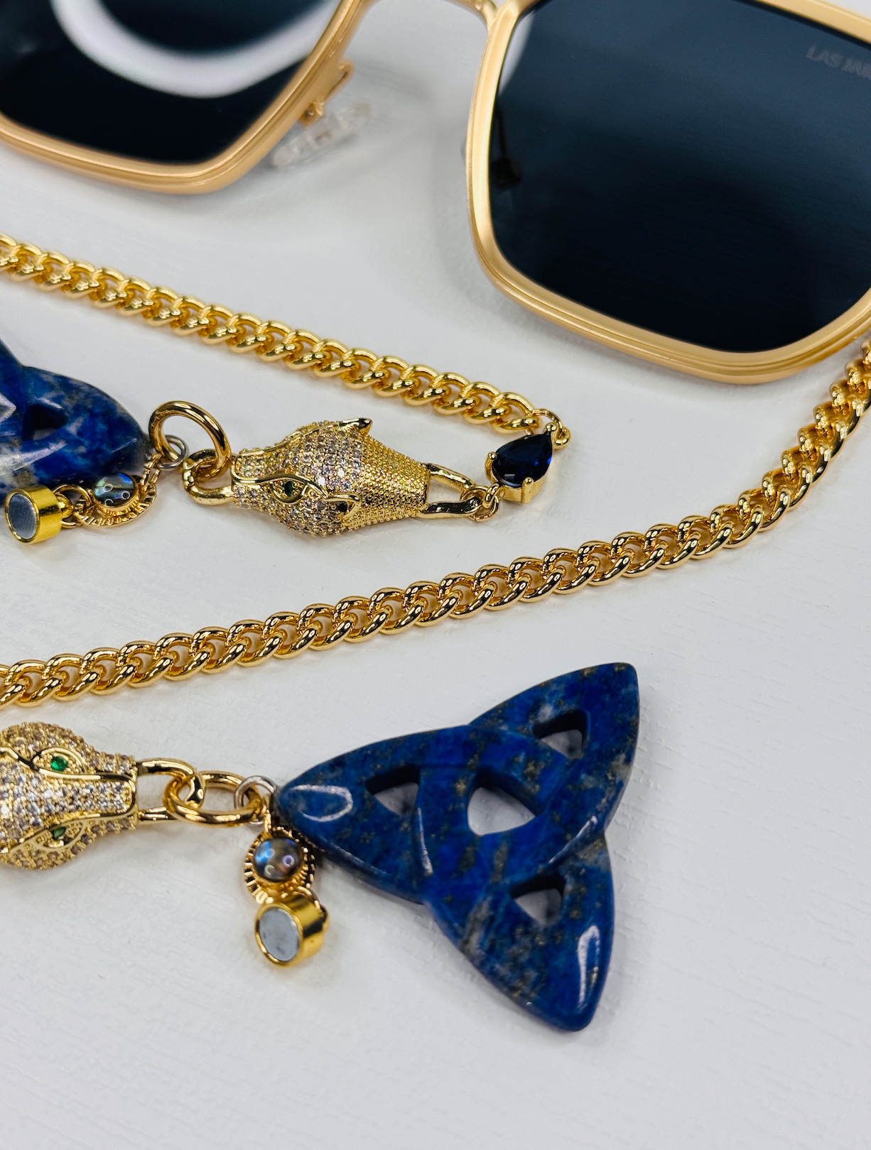 Square-shaped black sunglasses with 14k gold-plated chains with lapis lazuli quartz ends.